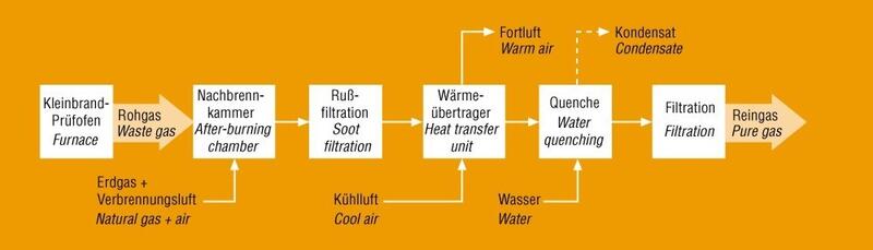Den Schadstoffen geht es in mehreren Schritten an den Kragen. Die Abgase, die bei den Brandversuchen entstehen, gelangen zunächst in eine Nachbrennkammer, wo ein Grossteil der Stoffe bei 1.100 Grad Celsius unschädlich gemacht wird. Anschließend folgt ein neuartiger Filter, der dem Ruß zu Leibe rückt. Nachdem die Abgase in zwei Phasen auf 150 Grad abgekühlt wurden, kommt ein Granulat zum Einsatz, das giftige Chlorsubstanzen bindet. Nun erst wird das gereinigte Abgas über einen Kamin an die frische Luft befördert.