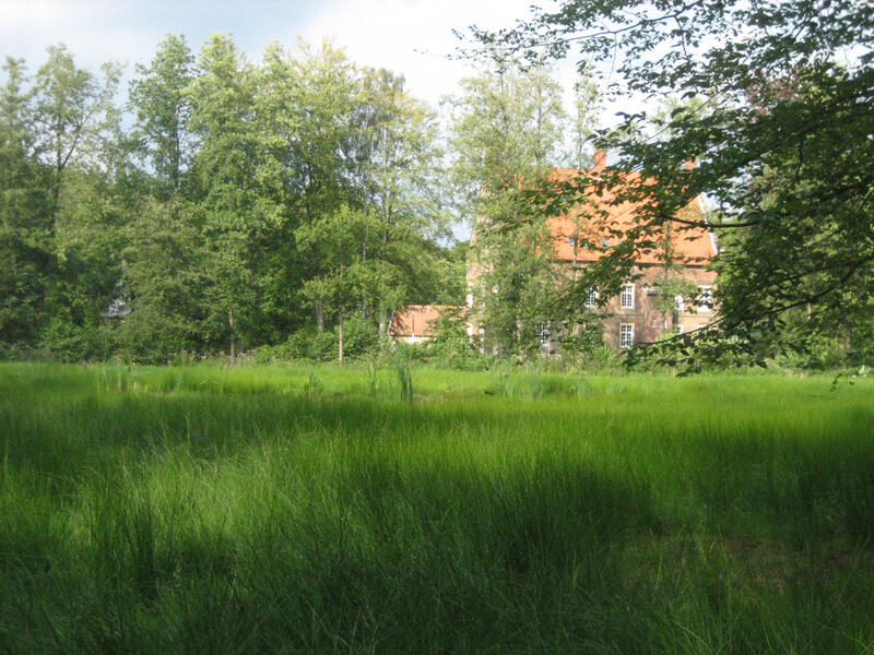 Im Rahmen des DBU-Projektes habe man daraufhin an der alten Bleiche – bis zum Beginn des 20. Jahrhunderts wurden weiße Textilien nach dem Waschen zur Farberhaltung in der Sonne ausgelegt und so gebleicht – ein so genanntes Rieselfeld eingerichtet: „Das Wasser fließt nun vor der Einleitung in die Gräfte durch das dicht mit einzelnen Süßgräsern und Binsen bewachsene Rieselfeld, das als ’biologischer Filter’ die Wasserbelastung deutlich senkt. Die Pflanzen nehmen die Nährstoffe aus dem Wasser auf und verwerten sie, das gereinigte Wasser fließt anschließend in die Gräfte“, erklärte Caesperlein das Verfahren. Im Juli eines jeden Jahres, wenn die Pflanzen die meisten Nährstoffe in Biomasse gebunden haben, werde die Bleiche gemäht und das Mähgut entfernt. So habe man die Konzentration von Nitrat und Nitrit im Wasser jeweils um über 90 Prozent senken können, bevor die Pflanzen in der Hausgräfte auf diese Stoffe zurückgreifen und dadurch wieder wuchern könnten.