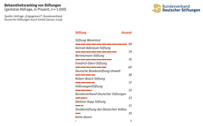 Nach dem aktuellen Report steht Engagement bei den Menschen insgesamt hoch im Kurs. Es sei eine staatsbürgerliche Pflicht, sagen mehr als die Hälfte der Umfrageteilnehmer. 62 Prozent meinen, freiwilliges Engagement sei wirkungsvoller bei der Übernahme von Gemeinwohlaufgaben, als wenn die Aufgaben öffentliche Stellen erledigten. Für einen Grundpfeiler bürgerschaftlichen Engagements halten sie Stiftungen. 57 Prozent der im Stiftungs-Report Befragten konnten auf Anhieb eine Stiftung nennen; vor fünf Jahren waren es noch sieben Prozent weniger. In diesem Zeitraum hat sich auch die Zahl der Stiftungen um ein Drittel auf 16.406 erhöht.