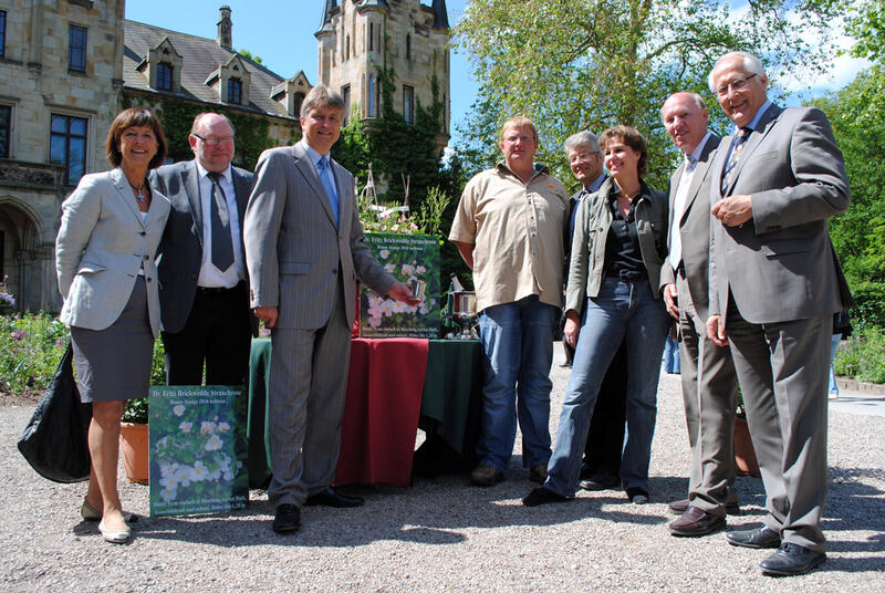 Osnabrück/Schloss Ippenburg. Rosen gehören weltweit zu den beliebtesten Zierpflanzen – seit über 2000 Jahren werden sie gezielt gezüchtet. Oft sind sie aber anfällig für Krankheiten und Parasiten. Ihr schönes Äußeres ist dann nur durch starken Chemikalieneinsatz zu erhalten. Jetzt besinnen sich manche Züchter auf alte Sorten zurück und landen im doppelten Sinne Erfolge: Die naturhaften neuen Kreuzungen sind hübsch anzusehen – und kommen obendrein ganz ohne umweltgefährliche „chemische Keule“ aus. Durch geschicktes Kreuzen können die robusten Eigenschaften von Wildrosen erhalten und zum Beispiel eine Unempfindlichkeit gegen Mehltau, Sternrußtau und Rosenrost erreicht werden. Das ist auch Sven Stange von der Rosenschule Stange aus Appen in Schleswig-Holstein gelungen. Erfreut zeigte sich heute der Generalsekretär der Deutschen Bundesstiftung Umwelt (DBU), Dr.-Ing. E. h. Fritz Brickwedde – er ist Namenspatron der neuen Rose.