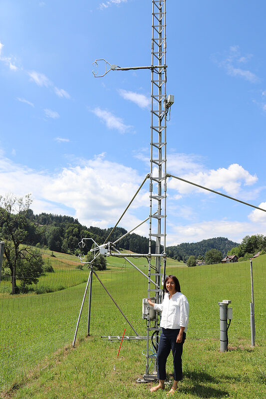 Prof. Dr. Sonia I. Seneviratne in der Feldstation Rietholzbach im Schweizer Voralpenland an einem Luftfeuchtemessgerät
