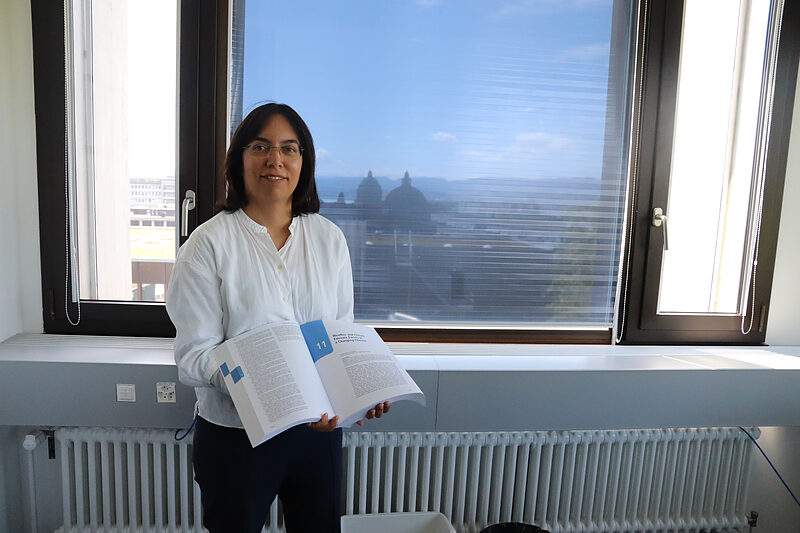 Prof. Dr. Sonia I. Seneviratne in ihrem Büro mit IPCC-Bericht und Blick auf das ETH-Hauptgebäude