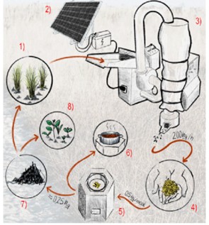 The project includes a holistic citizen energy approach. It addresses the problem of deforestation, soil erosion and the health aspects of cooking methods. The basis for this is a deforestation-free supply chain that involves the rural population and local authorities. An energy self-sufficient production of biomass pellets is being established, which in turn are charred in simple but energy-efficient pyrolysis ovens. This produces both the heat required for low-emission cooking and biochar, which is suitable as a permanent soil conditioner. The demonstration plant, its functional principle, the right plant and component design and initial on-site experience in the production of high-quality pellets are already available.