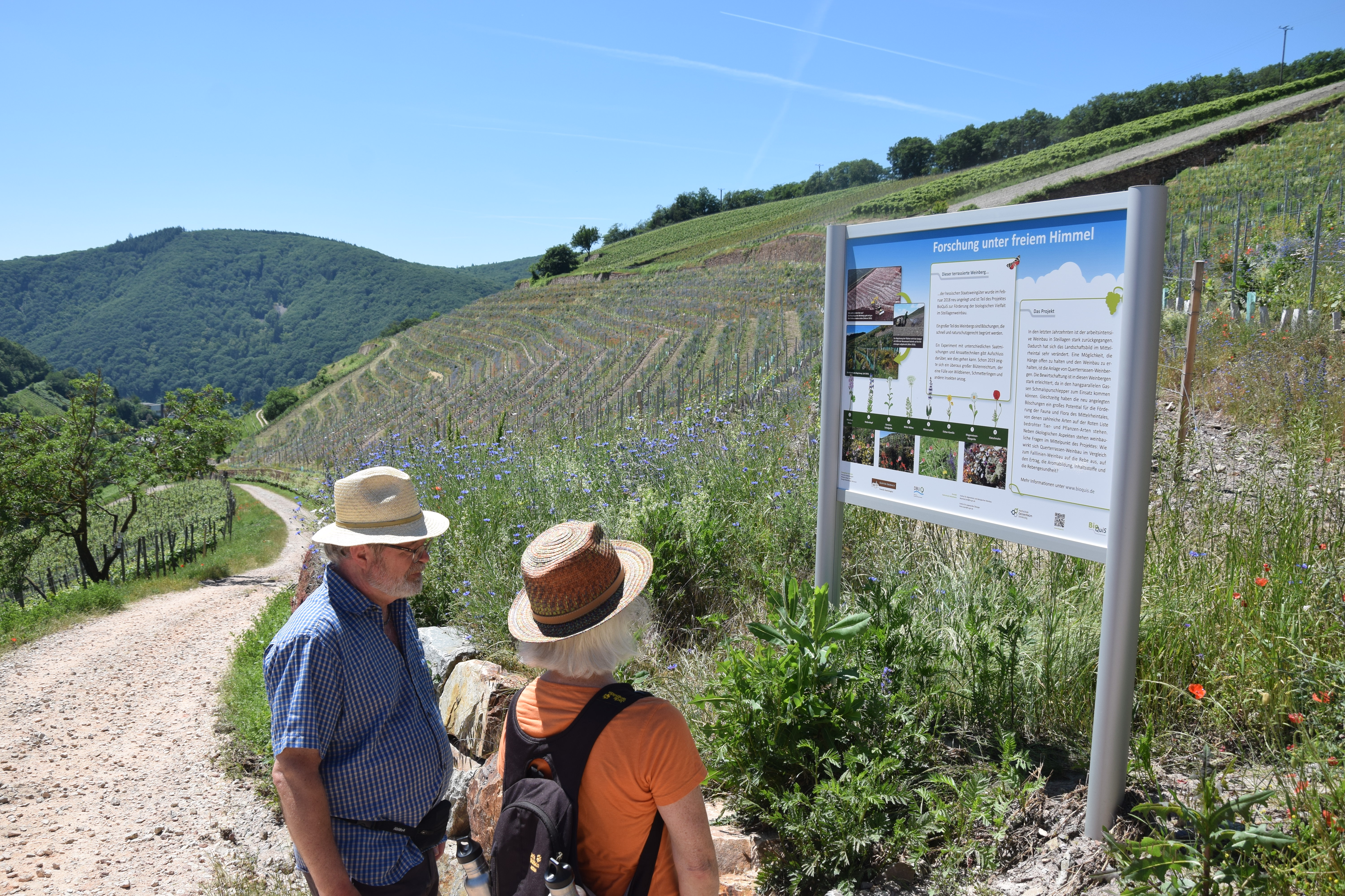 Eine im Jahr 2021 aufgestellte Schautafel an einem stark frequentierten Wanderweg (Rheinsteig), der an Querterrassenweinbergen der Hessischen Staatsweingütern vorbeiführt, informiert über die Artenvielfalt im Weinberg und macht auf die Bedeutung der Querterrassierung im Weinbau aufmerksam.