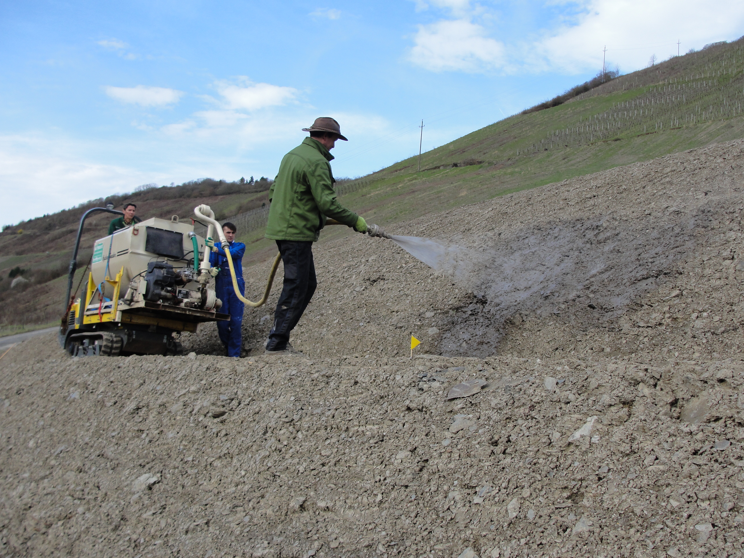 Um Empfehlungen für eine erfolgreiche Begrünung der Querterrassenböschungen geben zu können, wurden mehrere Saatmischungen, Ansaattechniken und verschiedene weitere „Starthelfer“ in zwei Begrünungsstudien an drei neu angelegten Querterrassenweinbergen getestet.