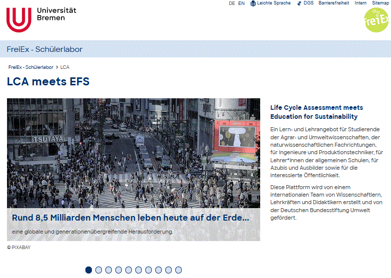 Die AUSSENDARSTELLUNG des PROJEKTS "LCA-meets-EfS = Life Cycle Assessment meets Education for Sustainability" erfolgt über eine Internet‐Seite unter der URL www.LCA‐meets‐EfS.net. Dadurch wird auch die internationale Erreichbarkeit unseres Angebotes sichergestellt. Eine direkte Weiterleitung auf URL https://www.uni-bremen.de/freiex/lca stellt das Hosting durch die Universität Bremen langfristig sicher. Die Lernangebote sind in deutscher und englischer Sprache verfügbar.