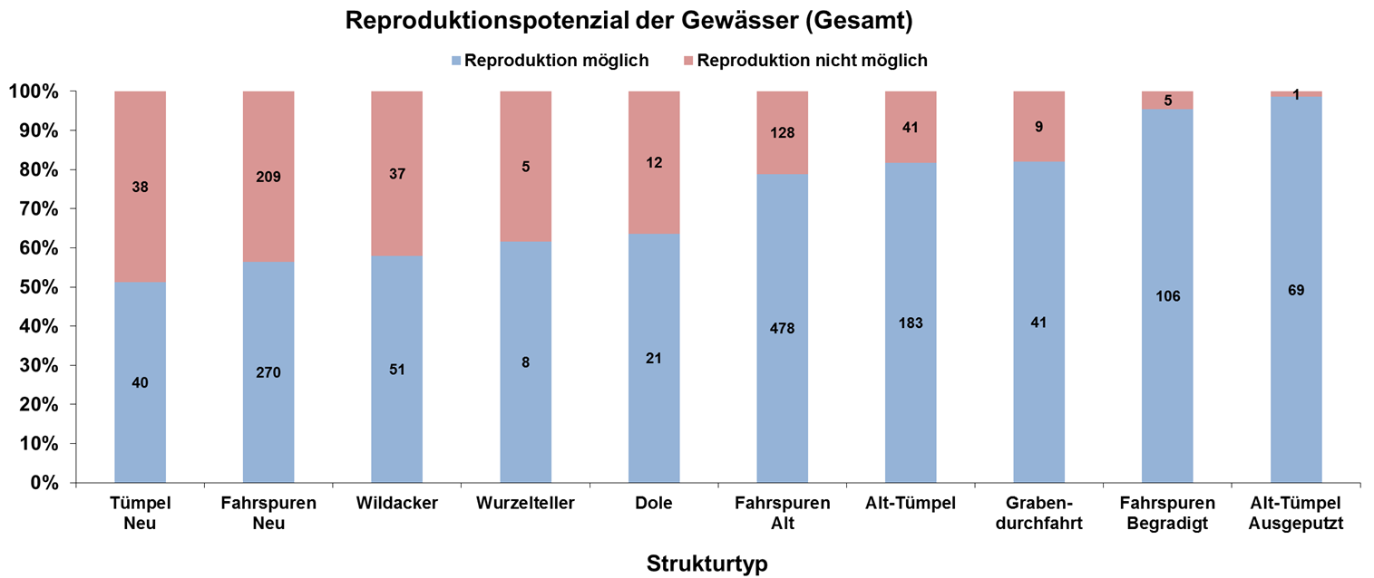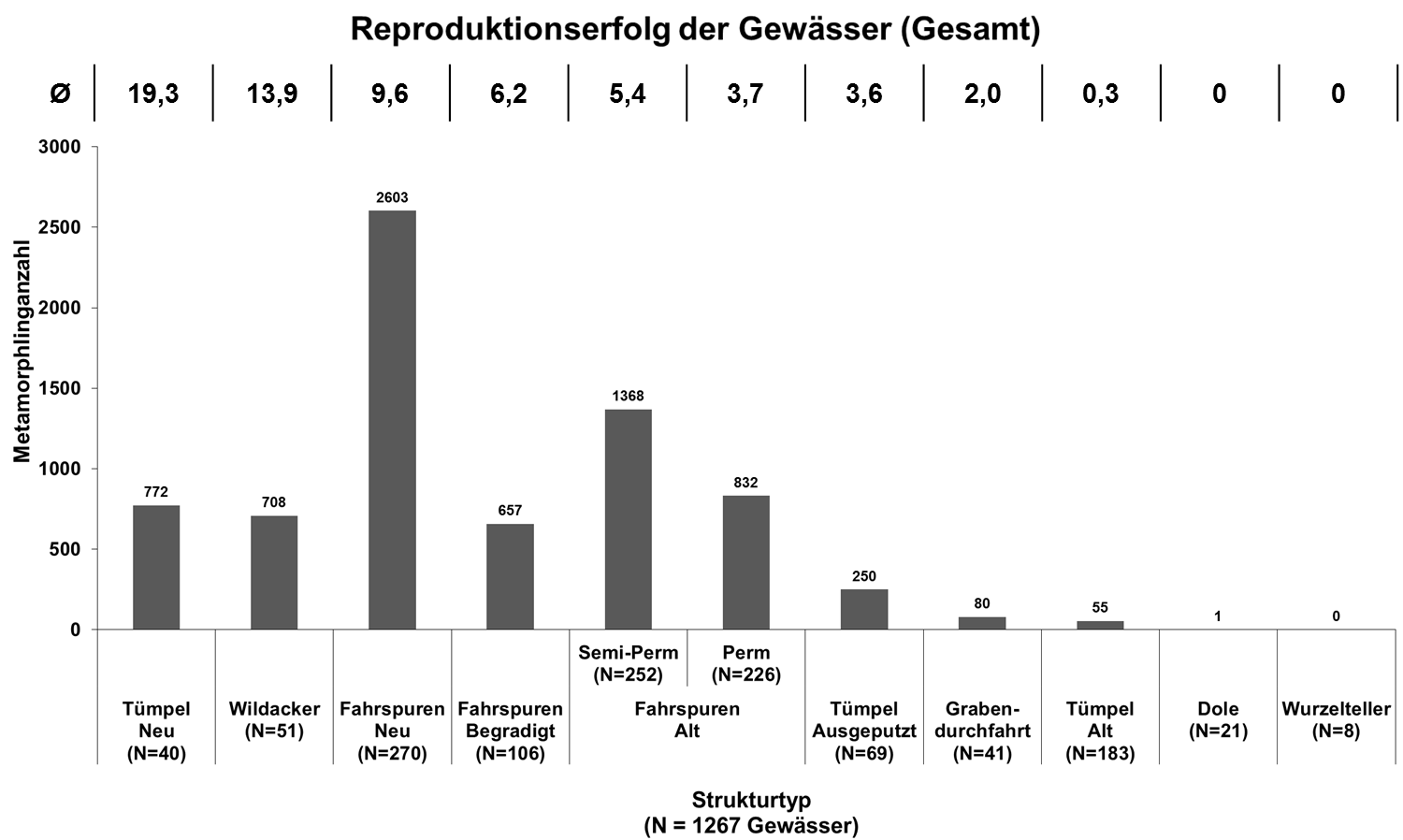 Der beste Reproduktionserfolg wurde für neue Baggertümpel im Erstjahr, Wildäcker / Dynamisierungsflächen mit Fahrspuranlagen und neue (seit mind. 5-10 Jahren nicht vorhandene) Fahrspurpfützen auf Rückegassen ermittelt. Dies reflektiert beste Erfolge unter den Rahmenbedingungen einer räumlichen und zeitlichen Dynamik. Dieser Gruppe folgten Kleinstgewässer auf Rückegassen mit einer Trockenpause welche entweder aktiv durch Begradigungen/Sanierungen und spätere Wiederbefahrung oder passiv durch selbstständige zwischenzeitliche Austrocknung und ggf. spätere Wiederbefahrung zumindest die zeitliche Dynamik gewährleisteten. Für permanente Altgewässer wie alte Fahrspuren, sanierte Alttümpel oder natürliche Altgewässer (inkl. Baggertümpel im zweiten Jahr nach ihrer Entstehung) wurde nur geringe oder keine Reproduktion gemessen. Eine Sanierung durch Zurückstellen der Sukzession von Altgewässern hebt den Erfolg lediglich auf das Niveau von alten permanenten und wiederdurchfahrenen Fahrspuren. Prädatoren von Laich und Kaulquappen werden durch Sanierungen nicht beseitigt. Kleinstgewässer in Grabenbereichen waren ebenfalls nur im Erstjahr erfolgreich, insofern diese das Wasser hielten. Kleinere Tümpel an Dolen und von selbst entstehende Wurzeltellertümpel waren übermäßig von Austrocknung betroffen, sodass es hier regelmäßig zum vollständigen Verlust der Kaulquappen kam und in den entsprechenden Gewässertypen kein Reproduktionserfolg gemessen werden konnte.