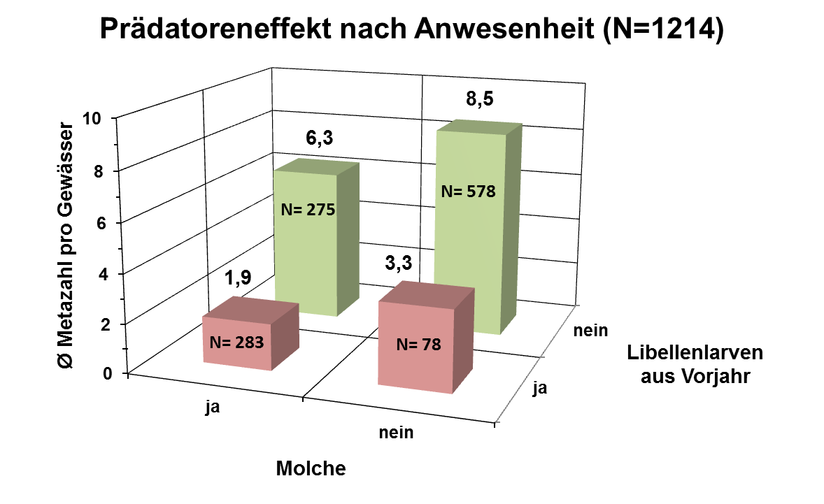 Zur Ermittlung der Ursachen für einen verringerten Reproduktionserfolg wurden alle Gewässer nach Anwesenheit von adulten Molchen und/oder Libellenlarven aus dem Vorjahr gruppiert und der durchschnittliche Reproduktionserfolg jeder durch die entsprechenden biologischen Parameter definierten Gewässergruppe dargestellt.