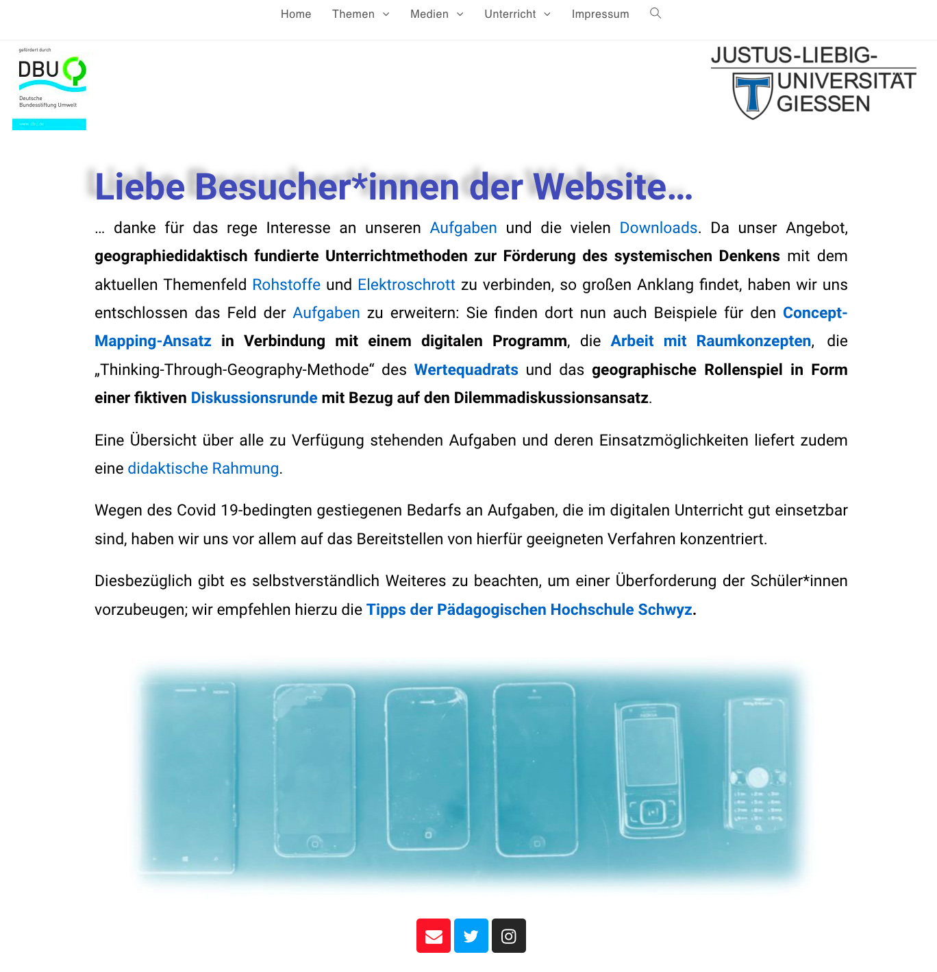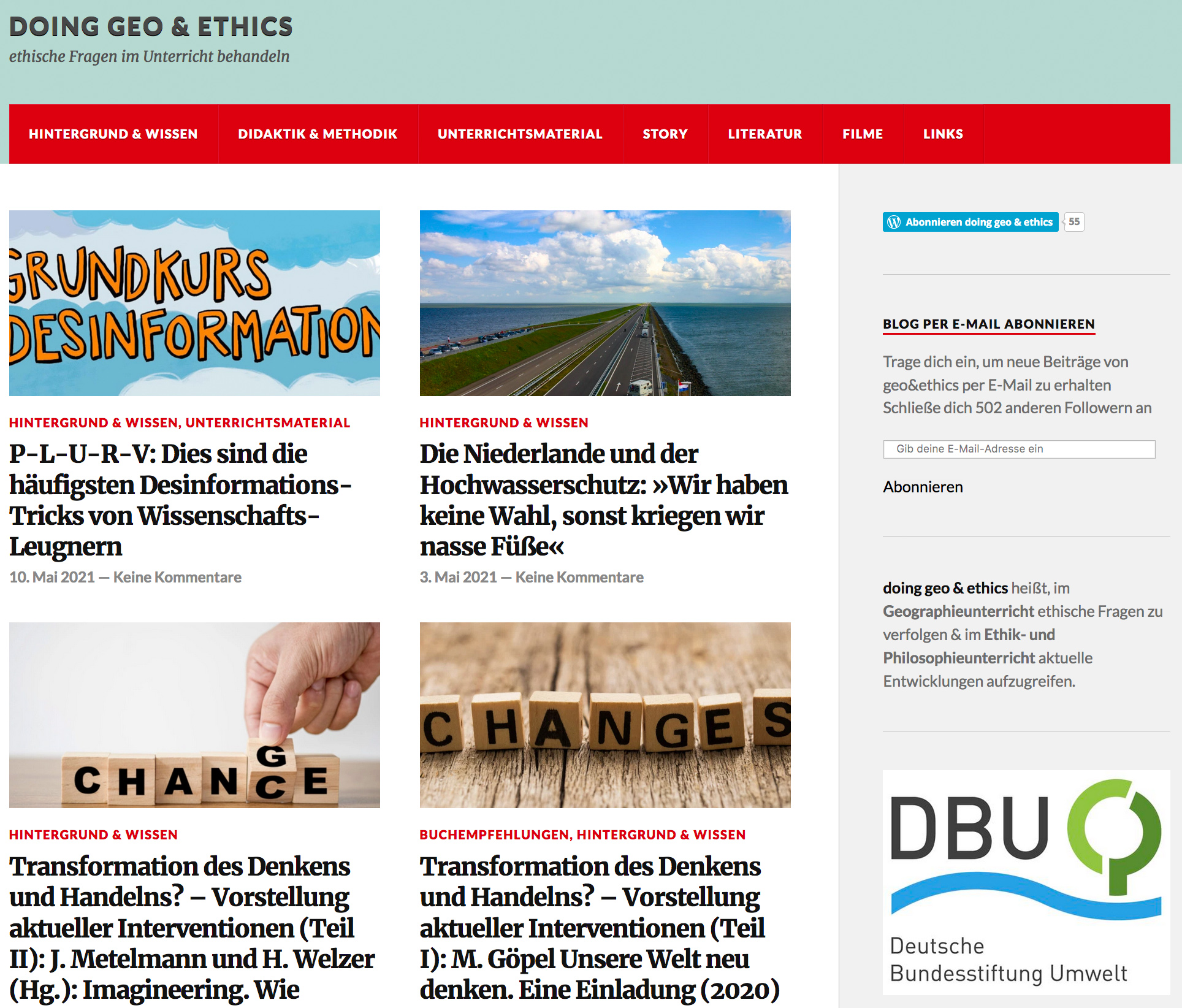 Die Erstellung der Website zum Projekt erwies sich als zentrales Element der Implementierungsleistung, wie die Statistiken zur Nutzung des Angebotes zeigen (s. Zwischenberichte). Der durch CoViD-19-bedingte Ausfalls des Unterrichts hat womöglich zu einer vermehrten Nachfrage nach Online-Unterrichtsmaterial geführt. Die neue Website respektive der Blog hat über in der Zwischenzeit erfasste Mail-Verteiler, in die neben Geographie- auch Ethiklehrkräfte als weitere Zielgruppe aufgenommen wurden, zusätzliche Möglichkeiten zur Anbindung weiterer Schulen an das Projekt ermöglicht – wir haben hier einen Stand von insgesamt 503 Follower*innen erreicht bei rund 1000 Besucher*innen pro Monat und ca. 8000 Aufrufen; die Schwelle, per Mail zu abonnieren ist in Zeiten von intensiven Diskussionen über Datenschutz selbstverständlich hoch. Die tatsächlichen Abrufzahlen und Besucherzahlen seit September 2020 zeigen, dass die Zahl der Nutzer allerdings deutlich höher liegt (s.o.). Die Arbeit an der zweiten Fassung der Projekt-Website wird nach dem Abschluss der Förderung im Februar 2021 weitergeführt, wir arbeiten ständig an einer Auswertung der Rückmeldungen von den Fortbildungen und passen unser Angebot entsprechend an; mittlerweile erscheint einmal pro Woche jeden Montagmorgen ein neuer Beitrag, was unserer Auswertung nach zu einer Stabilisierung und Erweiterung der Besucher*innenzahlen führt; die DBU ist mit Ihrem Emblem auf jeder Unterseite als Förderin ausgewiesen.