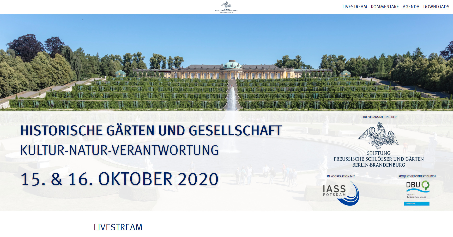 Der Kongress im Oktober 2020 konnte als Veranstaltung vor Ort nur in sehr reduziertem Rahmen stattfinden, weshalb ein hybrides Format gewählt wurde, das die Beteiligung via Livestream und Chatfunktion ermöglichte. Die einzelnen Veranstaltungspanels wurden nachträglich auf dem stiftungseigenen YouTube-Kanal bereitgestellt. Im Rahmen der Abschlussveranstaltung wurde diskutiert, wie das Potential der historischen Gärten vermittelt werden kann und wo Anknüpfungspunkte zu verschiedenen Zielgruppen bestehen.