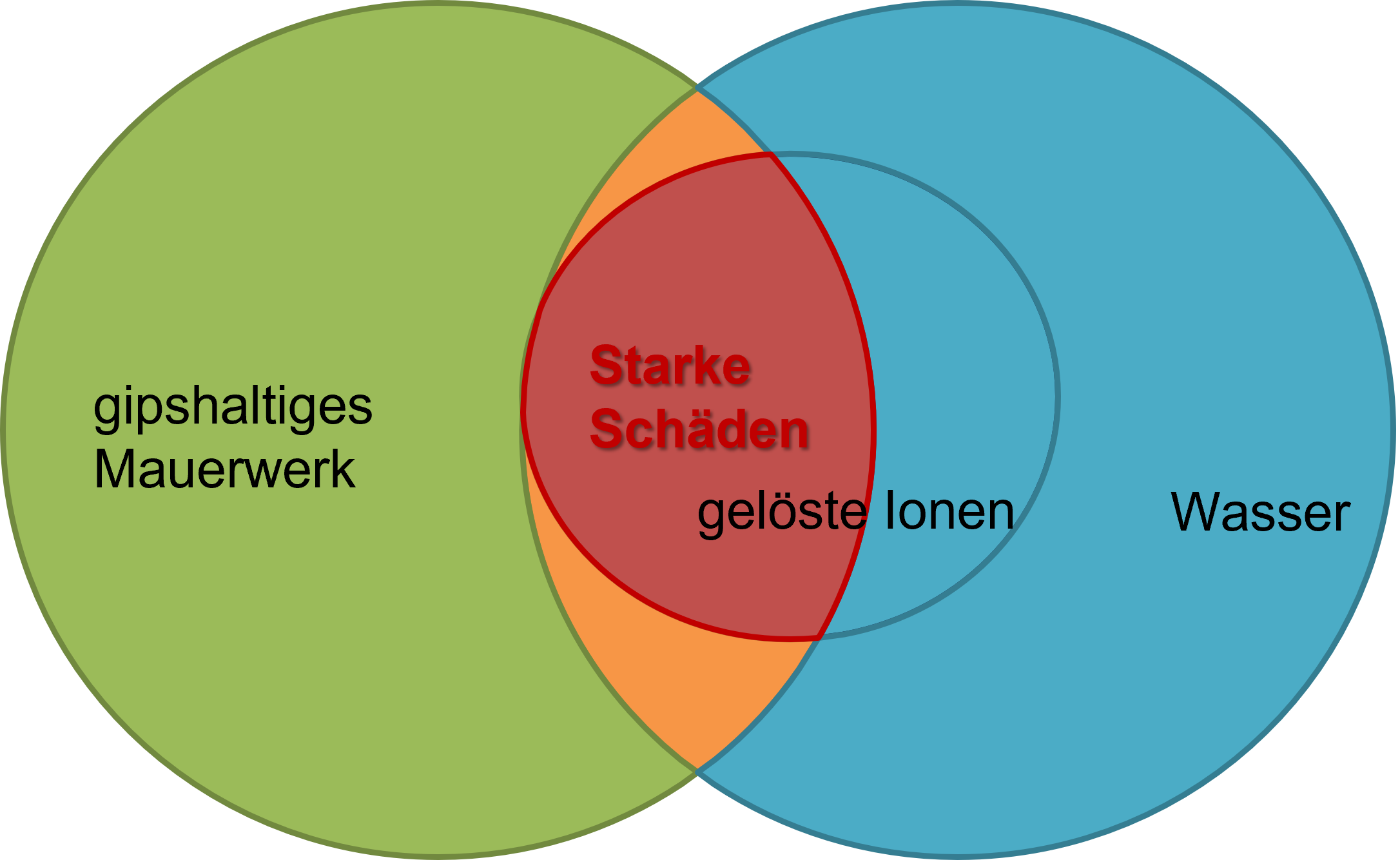 Zusammenfassend muss festgestellt werden, dass alle Schäden und Alterungserscheinungen im gipshaltigen Mauerwerk aus der Überlappung der Bereiche gipshaltiges Material, Wasser und gelöste Ionen resultieren.