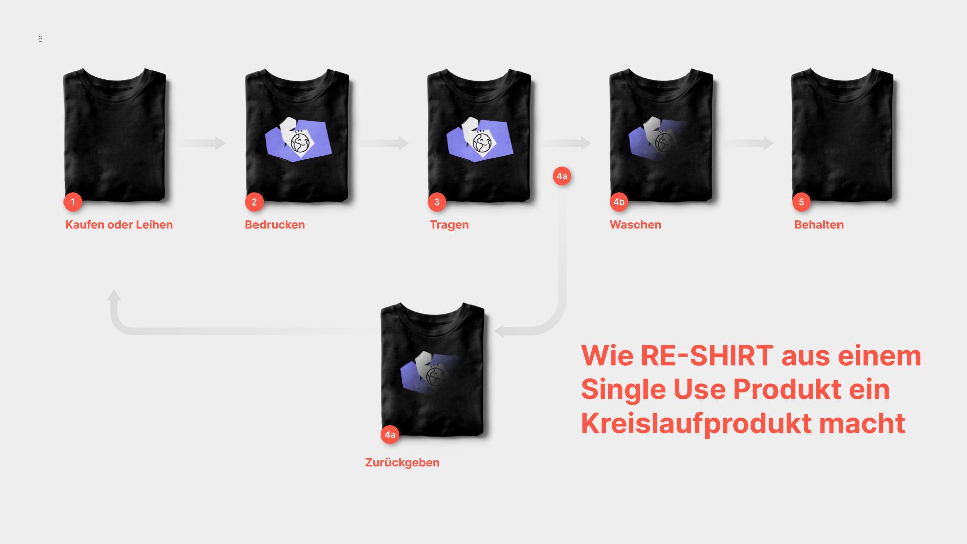 Aus wirtschaftlicher Sicht haben wir neben dem Aufbau der Marke RE-SHIRT ein Geschäftsmodell mit Produktportfolio aus drei Linien aufgezogen: Im B2B Bereich werden reversibel bedruckte T-Shirts im Leihmodell angeboten, ebenfalls B2B verkaufen wir reversibel oder kombiniert bedruckte Kleidungsstücke, das Auswaschen erfolgt dann durch die Träger:innen.