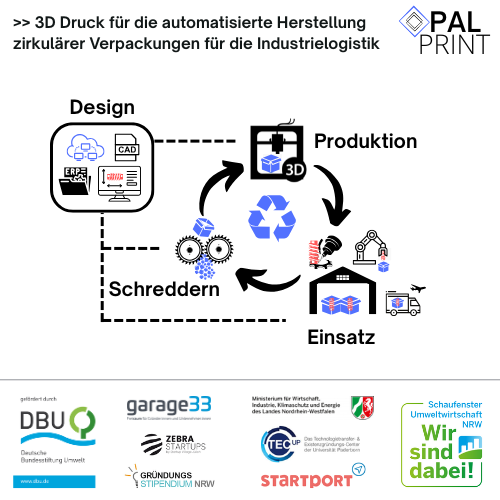 PALPRINT adressiert dieses Defizit mit einem innovativen Systemansatz: einer modularen, vor Ort installierten Produktionslösung, die industriellen Kunden maßgeschneiderte Mehrwegverpackungen aus recycelten Kunststoffen ermöglicht – direkt am Bedarfsort, ohne Werkzeugkosten, ohne Lieferkettenrisiken. Der Lösungsansatz lautet 3D-Druck für die automatisierte Herstellung zirkulärer Mehrweg-Verpackungen für die Industrielogistik.