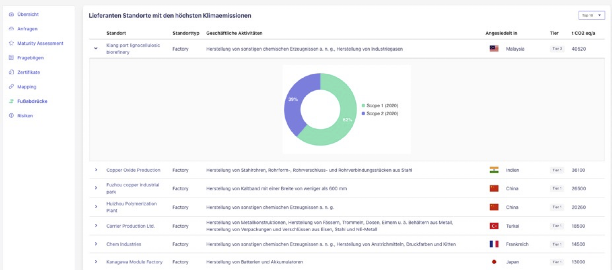 Zur Datenauswertung wurde im Rahmen des Förderprojektes eine Auswertung von Lieferanten-Standorten nach Höhe der Scope1,2-Emissionen umgesetzt sowie eine Auswertung der Produkt-Emissionen nach Gewicht oder Stückzahl.
