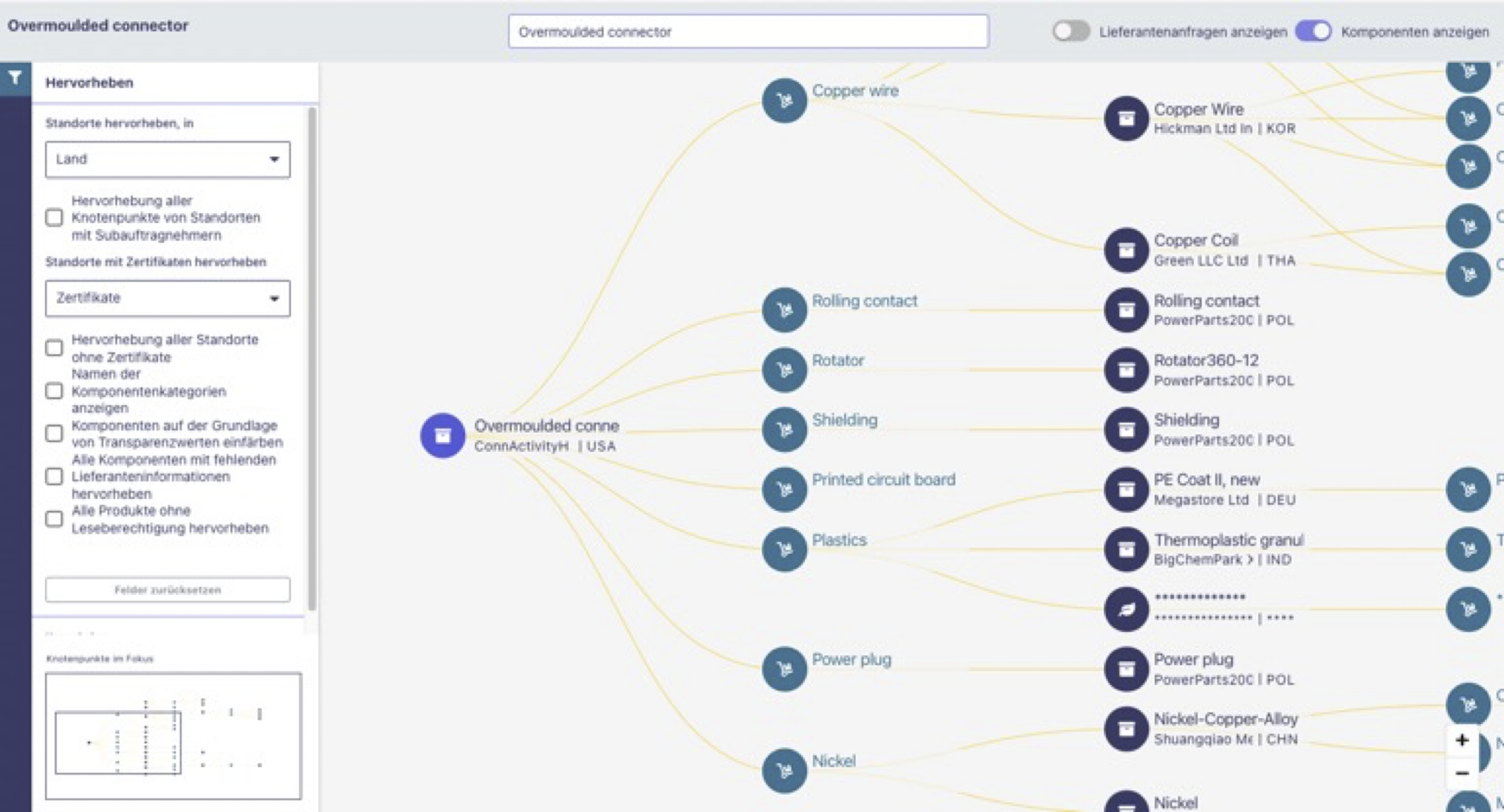 Diese Abfrage wird anschließend vom Lieferanten an den Vorlieferanten gesendet. Somit besteht immer bereits ein Geschäftsverhältnis zwischen dem anfragenden Unternehmen und dem Lieferanten. Die Anfrage wandert so von Knoten zu Knoten der Lieferkette bis zum Ursprung der Rohstoffe. Dieses Vorgehen wird auch „Supply Chain Mapping“ genannt. Im Rahmen des Mappings werden die Lieferbeziehungen automatisch digital abgebildet. Zahlende Nutzer/innen können die jeweils eigene vorgelagerte Lieferkette dann visualisieren und analysieren, Lieferanten können ihre eigenen Daten mit verschiedenen Kunden teilen, managen und die Daten ihrer direkten Lieferanten einsehen.