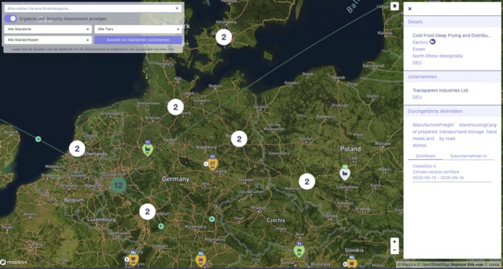 Im Anschluss an eine Status Quo-Bewertung kann ein Unternehmen entscheiden, ob bzw. an welcher Stelle die Transparenz auch für die vorgelagerte Lieferkette geschaffen werden sollte. Diese Informationen können dazu dienen, einen spezifischen PCF zu berechnen und zu kommunizieren oder CO2-Risiken entlang der gesamten Lieferkette besser einzuschätzen und zu adressieren. Um die Transparenz zu erhöhen, wird auf die bestehende Supply Chain Mapping-Funktion der sustainabill Cloud-Plattform zurückgegriffen.