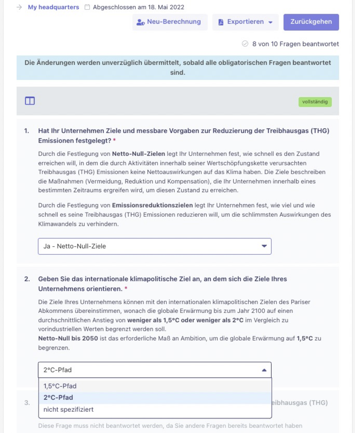 Gibt ein Lieferant in der Selbsteinschätzung an, dass er bereits Treibhausgase nach dem GHG Protocol erfasst, erhält er automatisch die Aufforderung, diese Daten im Unternehmensprofil zu hinterlegen.
