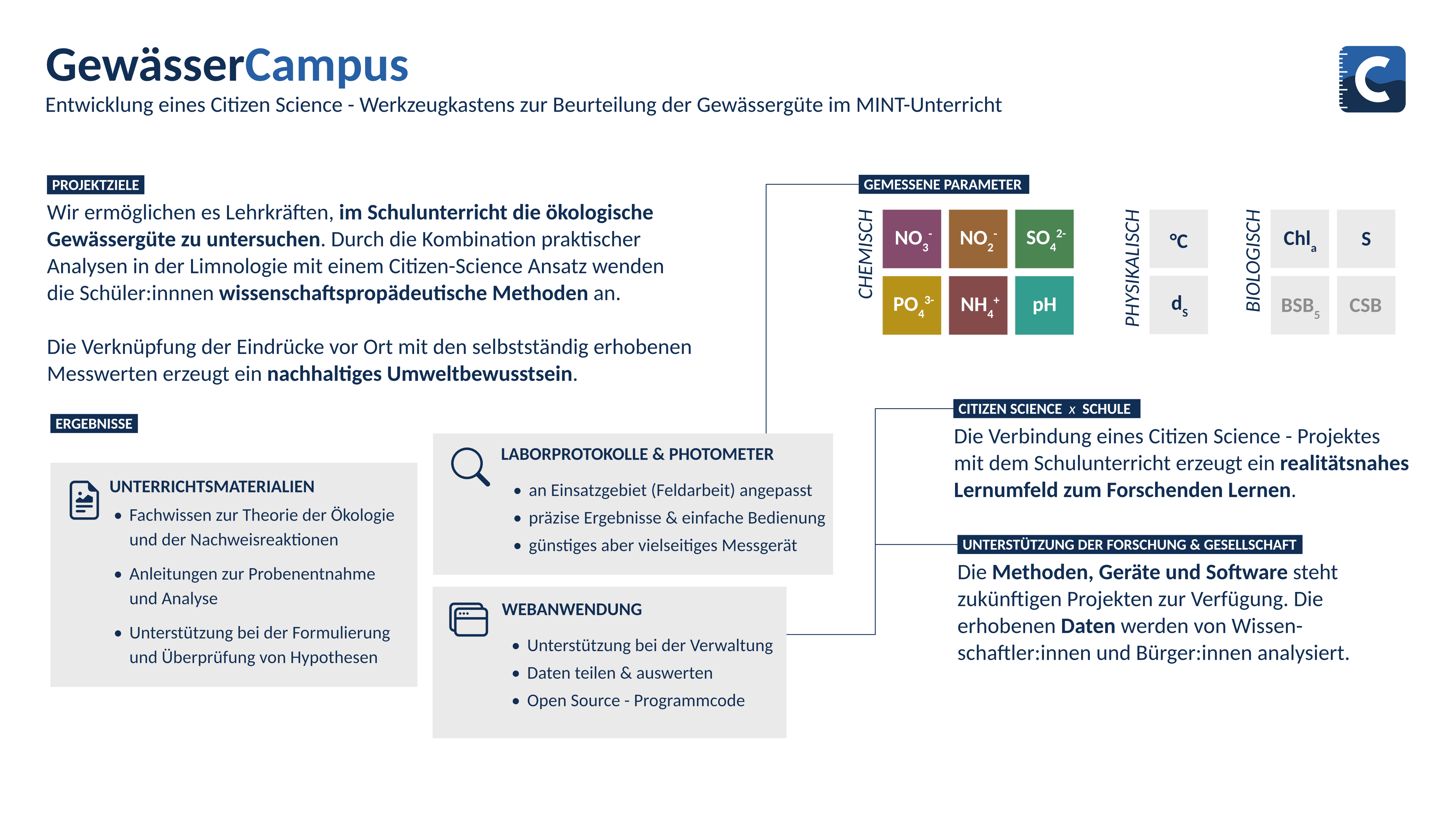 Im Zentrum dieses Projektes steht die Idee, dass Schüler:innen in direkt am Untersuchungsort durchgeführten Experimenten ein Gewässerprofil erstellen und auswerten. Parallel zu den experimentellen Protokollen soll ein didaktisch aufbereitetes, tragbares Photometer entwickelt werden, das sich für Feldversuche in diesem Kontext eignet. Indem sie die einzelnen Schritte, die zur Beantwortung einer Forschungsfrage nötig sind, selbstständig durchführen, soll den Schüler:innen die zentrale Kompetenz des wissenschaftlichen Arbeitens vermittelt werden. Dabei sollen durch die Integration eines Citizen Science - Ansatzes wissenschaftspropädeutische Kompetenzen erworben werden.
