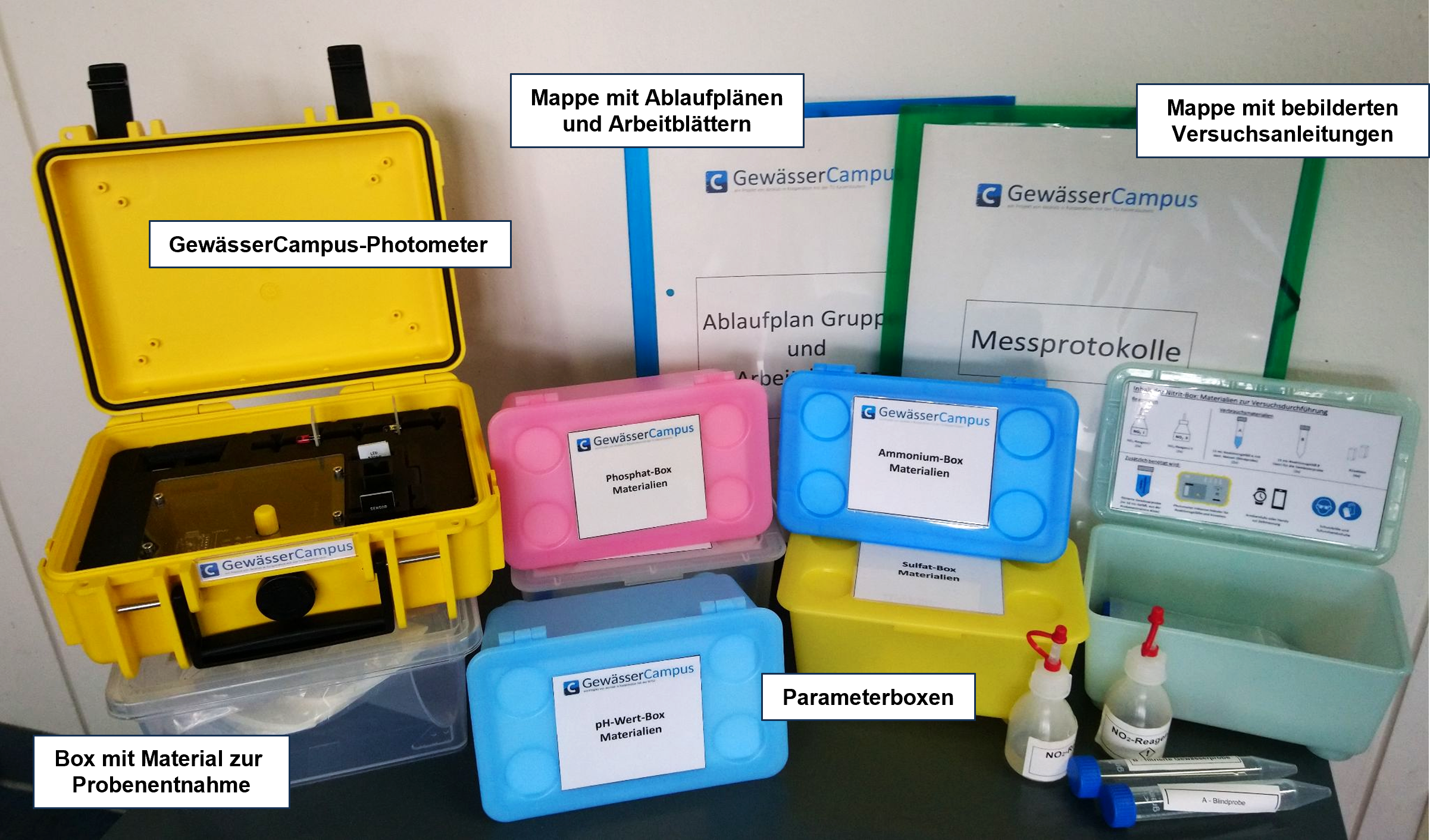 Im Verlauf des Projekts “ECOLAB - Photometrie im Sinne der Umweltbildung verstehen und anwenden”, umbenannt in "GewässerCampus", wurde ein Citizen Science-Werkzeugkasten (Abbildung 1) entwickelt, mit dem eine Untersuchung der ökologischen Gewässergüte im MINT-Unterricht ermöglicht wird. Die Projektergebnisse umfassen einfach durchzuführende Laborprotokolle, mit deren Hilfe, in Kombination mit dem didaktisch aufbereiteten und tragbaren Photometer, direkt am Untersuchungsort photometrische Experimente zur Quantifizierung der für den chemischen Gewässerzustand charakteristischen Parameter pH-Wert, Phosphat, Nitrat, Nitrit, Ammonium, Sulfat, Gelöstsauerstoff- und Chlorophyll-a-Gehalt erfolgen kann. Ergänzend dazu vermitteln die begleitenden Unterrichtsmaterialien die wichtigsten theoretischen Hintergründe sowie zu den verwendeten Nachweisreaktionen. Die erarbeiteten Unterrichtsmaterialien beinhalten auch leicht verständliche, bebilderte Anleitungen zur Durchführung der Experimente und eine Erklärung und Anleitung für die Berechnung chemischer Gewässergüteindizes: den BACH-Index (Fließgewässer) und den Trophie-Index (stehender Gewässer). Die chemische Gewässergüte wird dabei auch im Kontext der Gewässerstrukturgüte und der biologischen Gewässergüte betrachtet, deren Bestimmung ebenfalls unterstützt wird. Alle entwickelten Materialien sind öffentlich einsehbar und können von interessierten Lehrkräften im Regelunterricht als auch in extracurricularen Projekten eingesetzt werden.