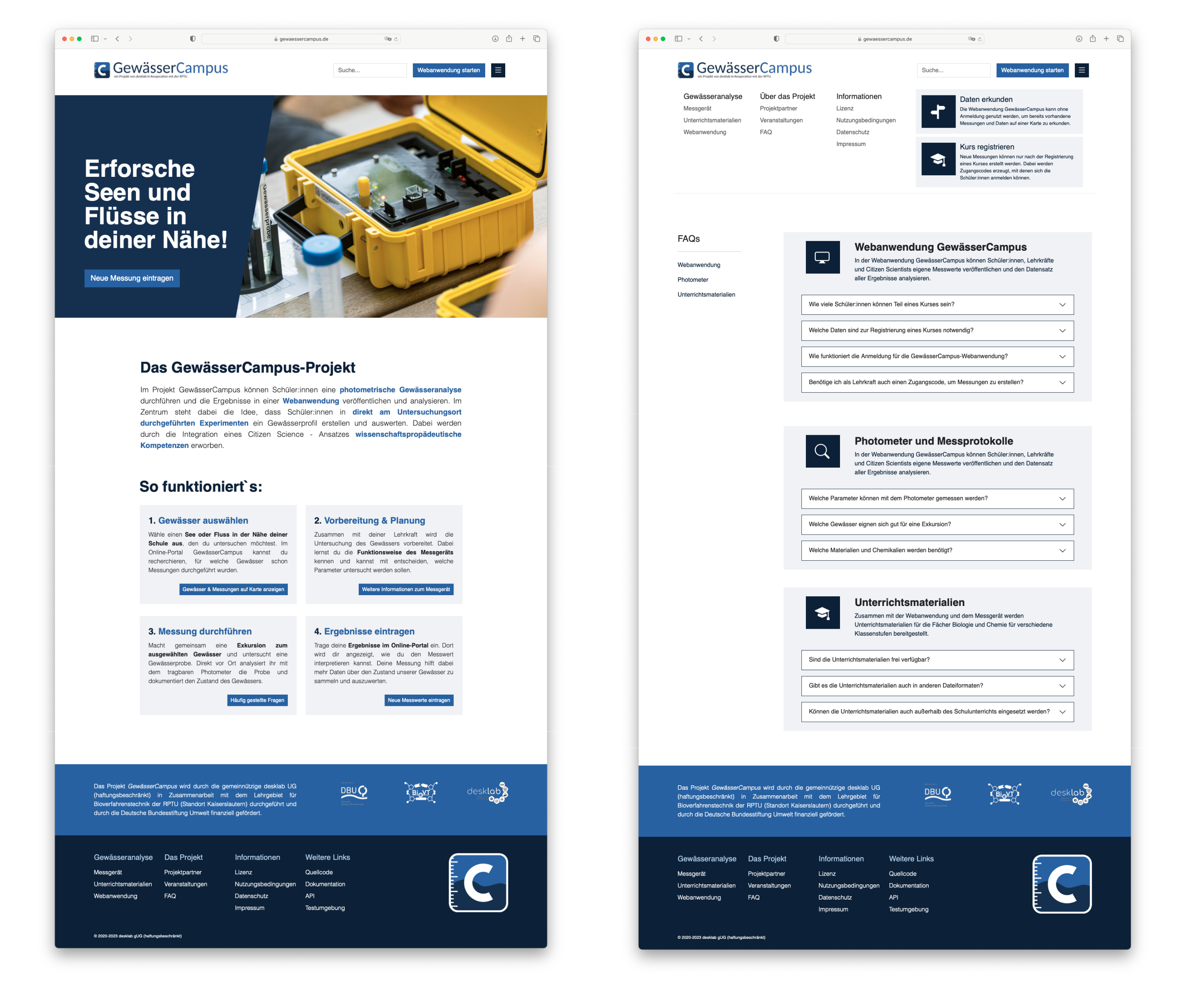 Die bei der Gewässeranalyse erhaltenen Messergebnisse können von den Schüler:innen in einer im Projekt entwickelten Open-Source-Webanwendung (app.gewaessercampus.de), ausgewertet und veröffentlicht werden. Durch die Datenerhebung tragen die Schüler:innen als Citizen Scientists zur Erstellung und Vervollständigung eines Gewässerprofils auf Grundlage einer realen Datenbasis bei und können alle Phasen des wissenschaftlichen Prozesses der Erkenntnisgewinnung an einem authentischen Projekt erleben und lernen.