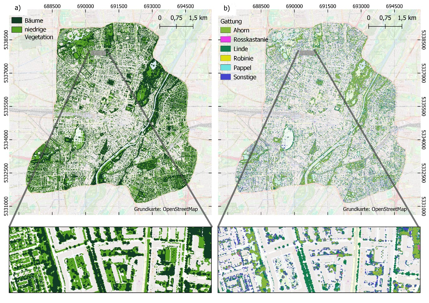 Zur Klassifikation der Stadtbäume wurde ein Machine-Learning-Ansatz auf Basis von in-situ erhobenen Baumdaten eingesetzt. Die Methode wurde zunächst auf einem 4 km² großen Testgebiet erprobt und anschließend erfolgreich auf ein 44 km² großes Gebiet von München innerhalb des Mittleren Rings angewendet. Insgesamt konnten dabei über 160.000 Einzelbäume aus Fernerkundungsdaten klassifiziert werden.