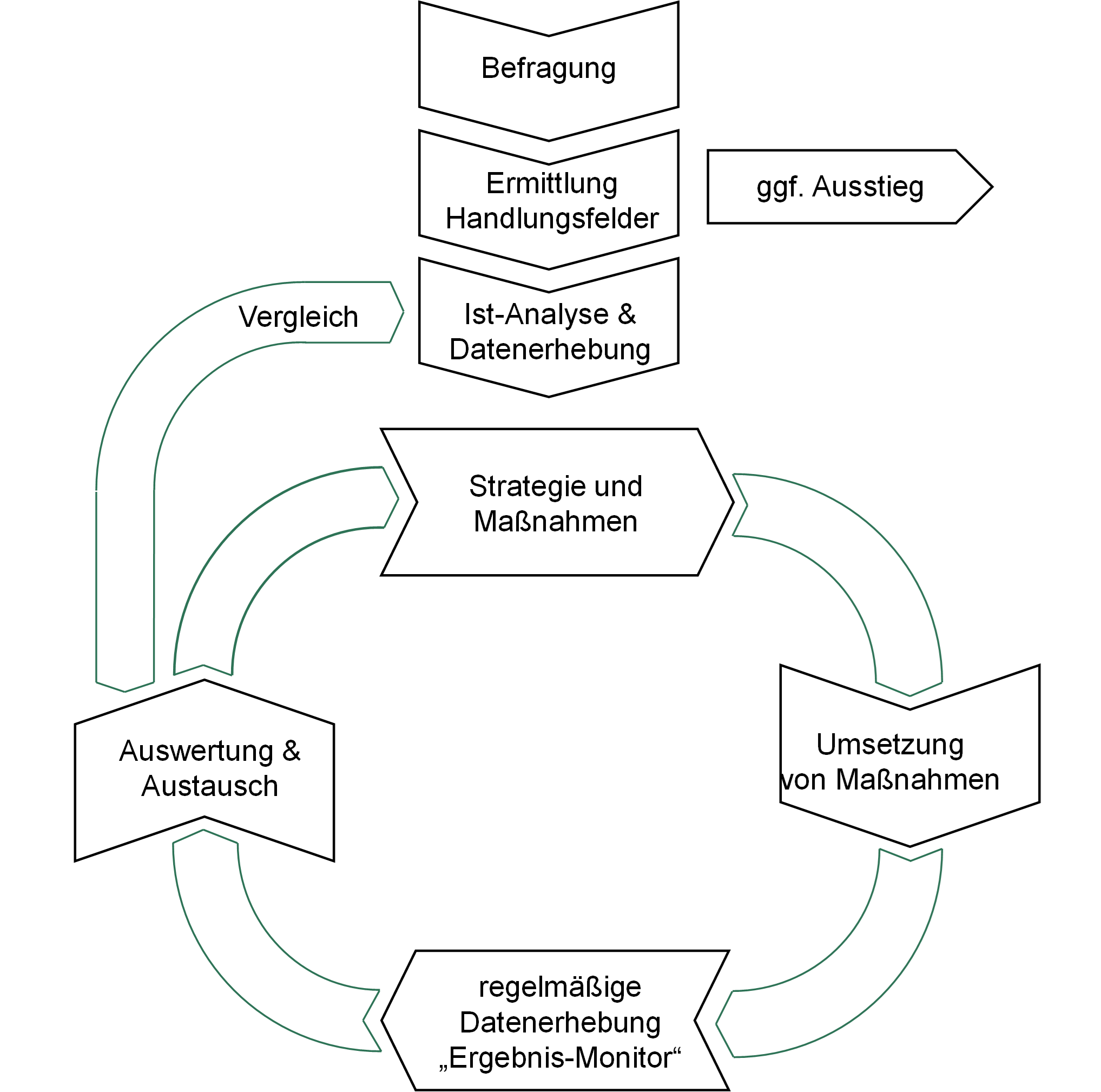 Online-Community zur Vernetzung, Handlungsempfehlungen, Leitfäden und ein Maßnahmenkatalog mit 48 möglichen Maßnahmen. Durch regelmäßige Datenerhebung und Auswertung über den Ergebnis-Monitor wurden Indikatoren mit der Ist-Analyse verglichen.