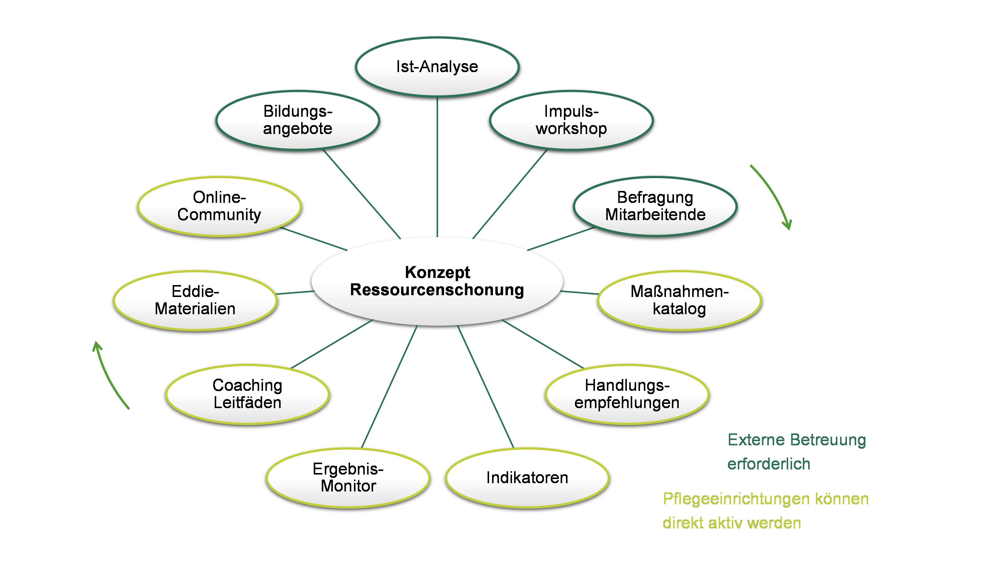 •	Entwicklung eines Konzepts zur Ressourcenschonung in Pflegeeinrichtungen gemeinsam mit zehn Piloteinrichtungen aus den Regionen Baden-Württemberg, Niedersachsen und Nordrhein-Westfalen. Es soll ein Baukasten an Lösungsansätzen entstehen, der für die individuelle Situation jeder Einrichtung passende Maßnahmen enthält.