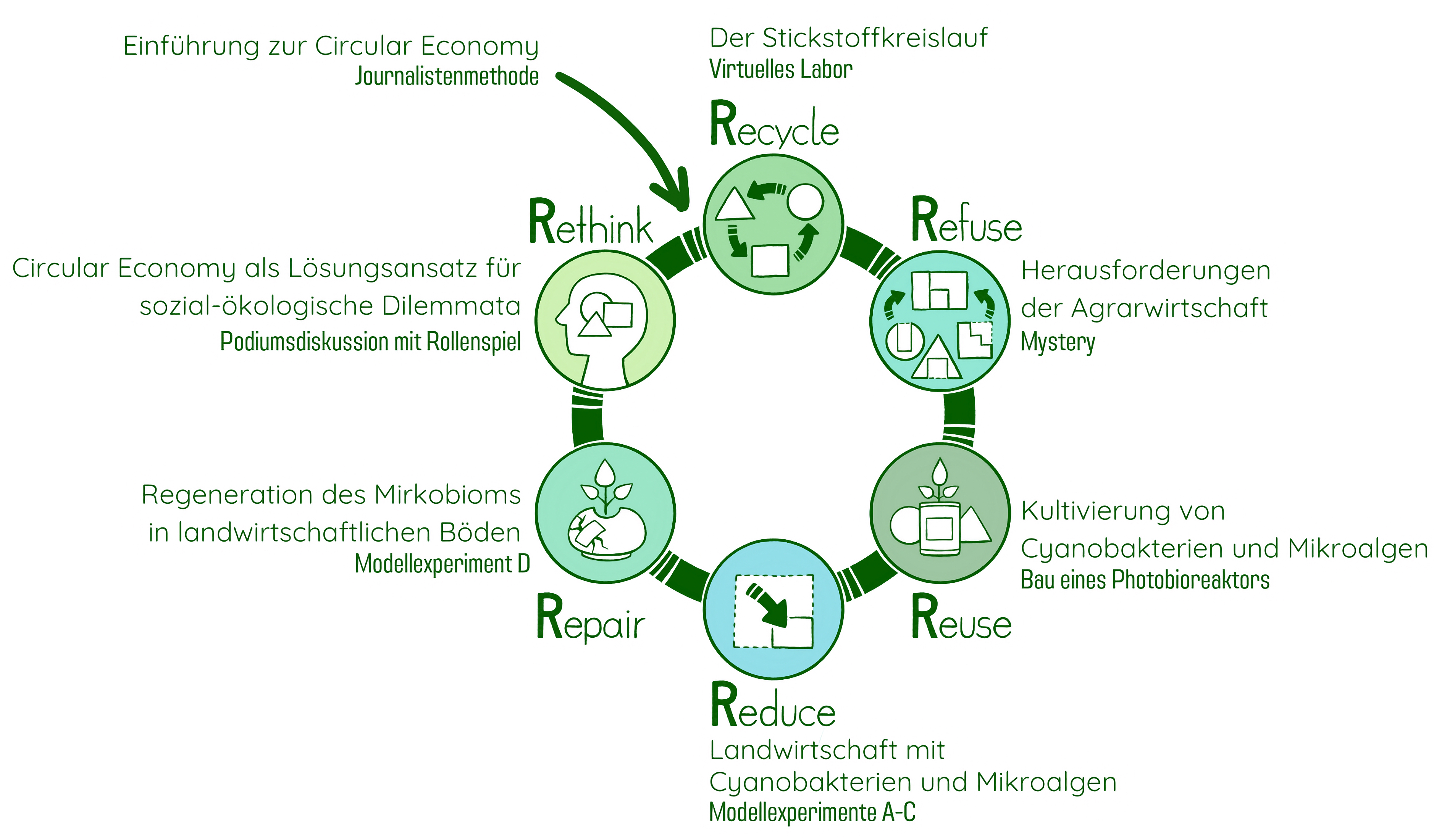 In dem Projekt CEASEless „Circular Economy Begreifen – Algen im Schülerlabor Erforschen“ lernen Schülerinnen und Schüler der zehnten bis 13. Jahrgangsstufe das Potenzial von Mikroalgen und Cyanobakterien für eine Circular Economy (CE) kennen. Ziel von CEASEless ist es, Jugendliche mit dem CE-Konzept vertraut zu machen (Circular Literacy), sie zu einer nachhaltigen Mitgestaltung ihrer Umwelt zu aktivieren (Beteiligung) und sie in ihrer Resilienz im Umgang mit ökologisch-sozialen Nachhaltigkeitsdilemmata zu stärken (Ambiguitätstoleranz). Im Rahmen von vier Terminen (jeweils halbtags) setzen sich die Lernenden sowohl in der Schule als auch am außerschulischen Lernort experimentell-forschend und kritisch-analytisch mit den sechs Prämissen einer CE – Recycle, Refuse, Reuse, Reduce, Repair und Rethink – auseinander.