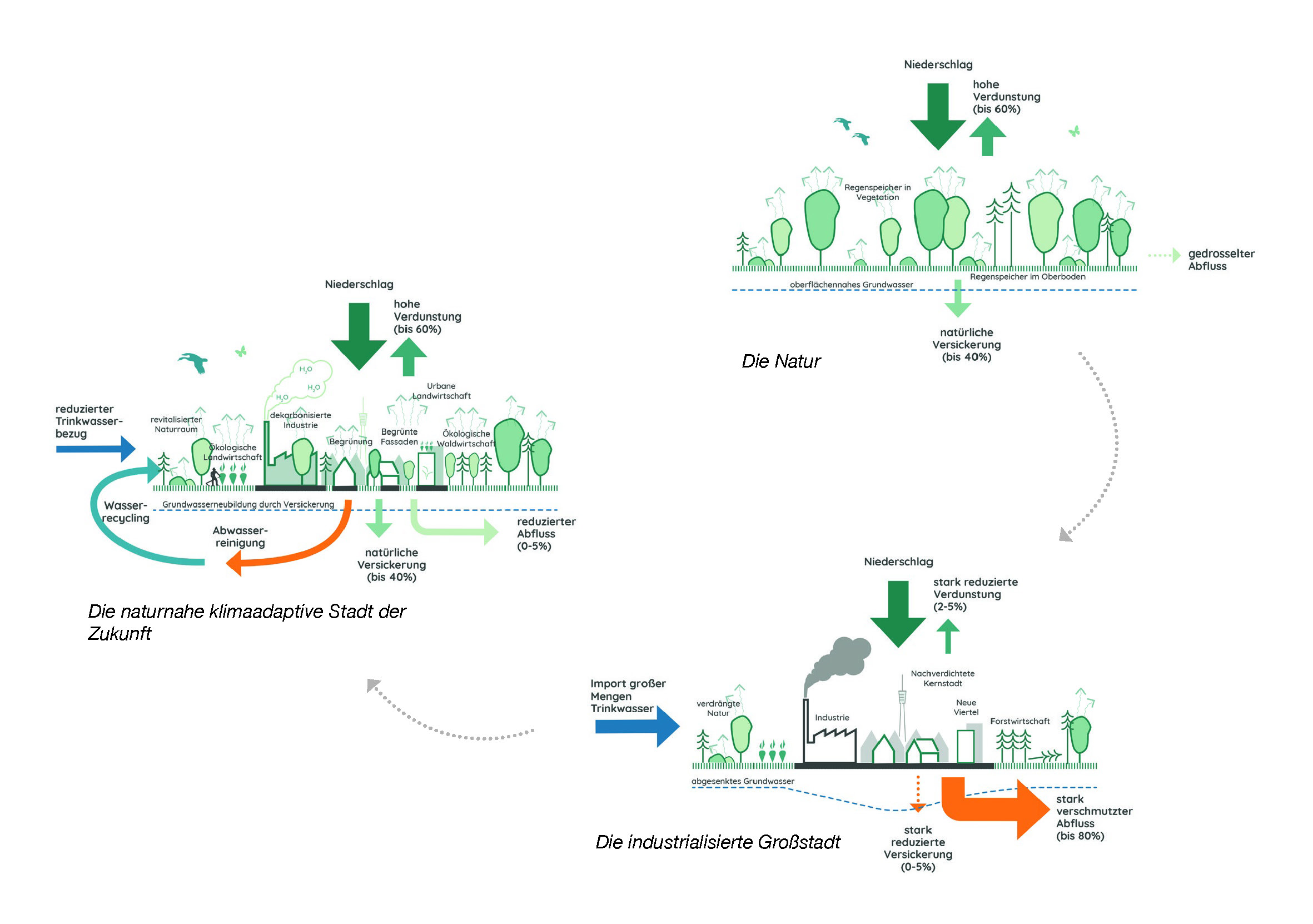 Die Analyse des Regenwasserhaushalts im Fellbacher Gewerbegebiet zeigt, dass 67 % der Fläche versiegelt sind, was zu hohen Abflussmengen und einer geringen Verdunstungs- sowie Versickerungsrate führt. Modellrechnungen ergeben, dass durch eine Kombination aus Begrünungs- und Entsiegelungsmaßnahmen der Abfluss um bis zu 32 % reduziert und der Wasserhaushalt in Richtung eines naturnahen Systems verbessert werden kann. Dabei wird deutlich, dass Dachbegrünungen allein nicht ausreichen, sondern großflächige Freiraummaßnahmen notwendig sind.