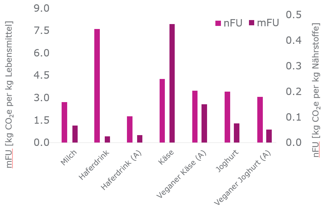 Die Anwendung der klassischen mFU resultiert in einer 2,3- bis 2,7-fach höheren CO₂-Bilanz von Milch im Vergleich zu Haferdrink ohne und mit Nährstoffanreicherung. Demgegenüber zeigt sich unter Anwendung der nFU lediglich eine 1,5-fache höhere CO₂-Bilanz von Milch im Vergleich zu einem mit Lebensmittelzusatzstoffen (u.a. Vitamin B12) angereicherten Haferdrink. Ein Vergleich von Milch und Haferdrink ohne Lebensmittelzusatzstoffe zur Nährstoffanreicherung auf Basis der nFU zeigt, dass sich der Trend umkehrt. Die CO₂-Bilanz des Haferdrinks ist demnach um den Faktor 2,8 höher als die von Milch. Die Anwendung der mFU führt bei Käse und Joghurt zu einer jeweils um den Faktor 3,1 und 1,5 höheren CO₂-Bilanz im Vergleich zu den pflanzlichen Alternativprodukten. Beim Wechsel zu einer nFU ist die CO₂-Bilanz lediglich um den Faktor 1,2 für Käse und 1,1 für Joghurt erhöht.