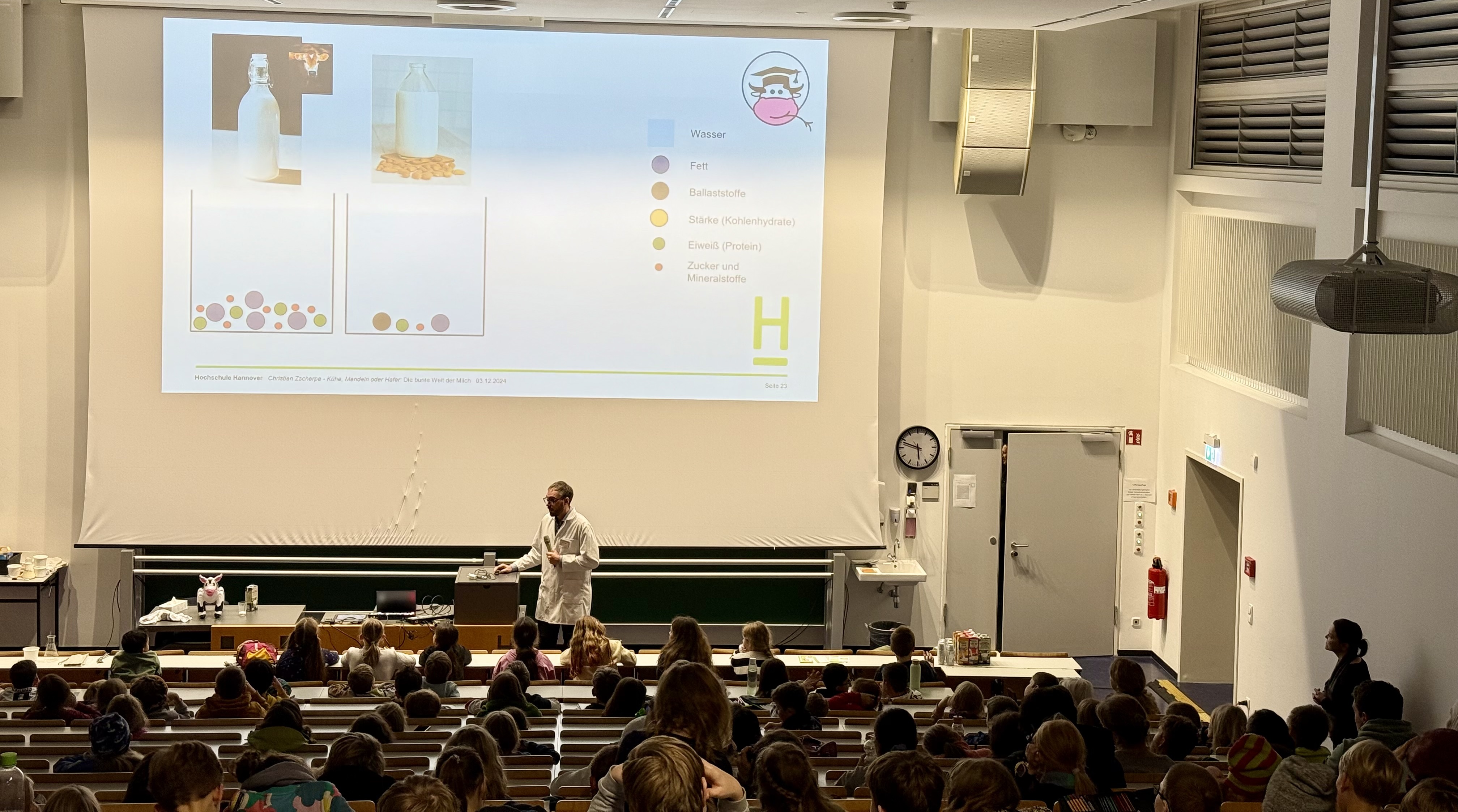Die Hochschule Hannover hat sich im Rahmen des Projekts mit dem Vortrag "Kühe, Mandeln oder Hafer: Die bunte Welt der Milch" an der KinderUniHannover, einer Vorlesungsreihe speziell für acht- bis zwölfjährige Kinder beteiligt. Das Ziel der KinderUniHannover ist in anschaulich gestalteten, kindgerechten Veranstaltungen spannende Einblicke in die Welt der Wissenschaft zu vermitteln und bei den teilnehmenden Kindern Neugier und Forschungsdrang zu fördern.