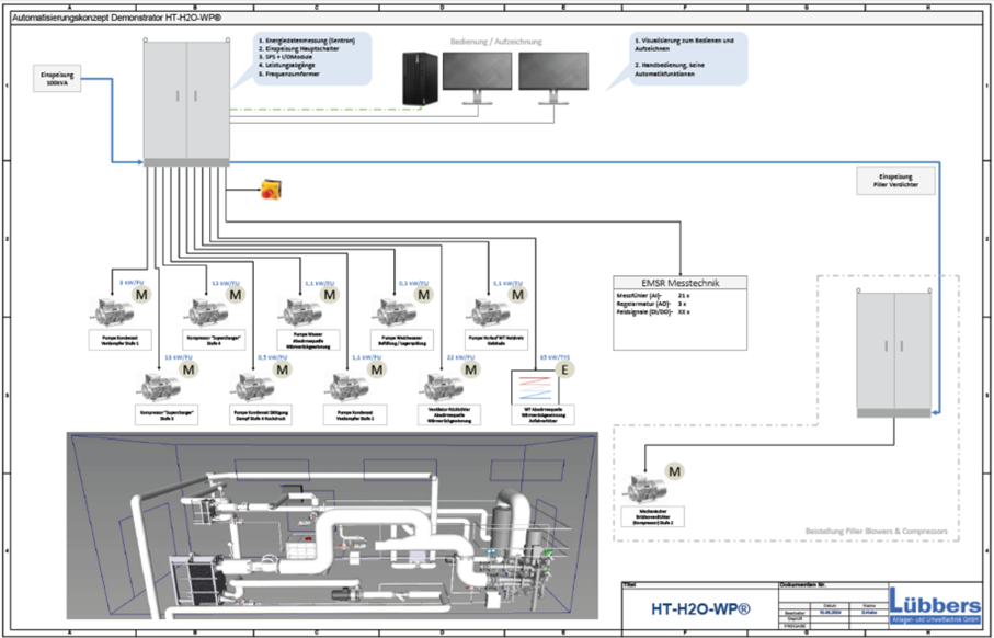 Im Rahmen eines abgeschlossenen F&E-Vorhabens wurde von der Fa. Lübbers in Kooperation mit der Uni Erlangen eine innovative Hochtemperatur-Wärmepumpen (HTWP) konzipiert. Diese zeichnet sich durch den Einsatz des umweltfreundlichen Kältemittels Wasser aus und soll in sehr weiten Leistungsgrenzen skalierbar sein.