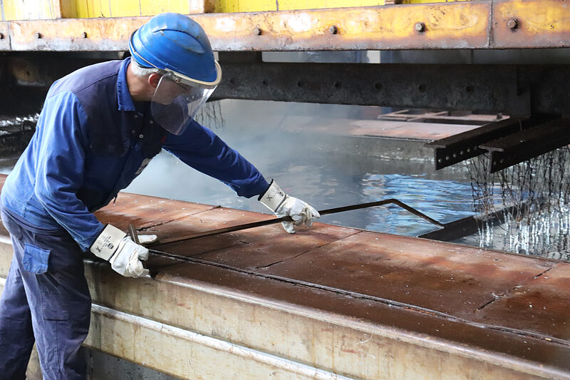 Ein Arbeiter im Stahlverzinkungsbetrieb ZINQ am Standort Hagen beim Abschöpfen der sogenannten Zinkasche, die nach einem Zinkbad von Stahlteilen auf der Oberfläche verbleibt und so wiederverwendet werden kann