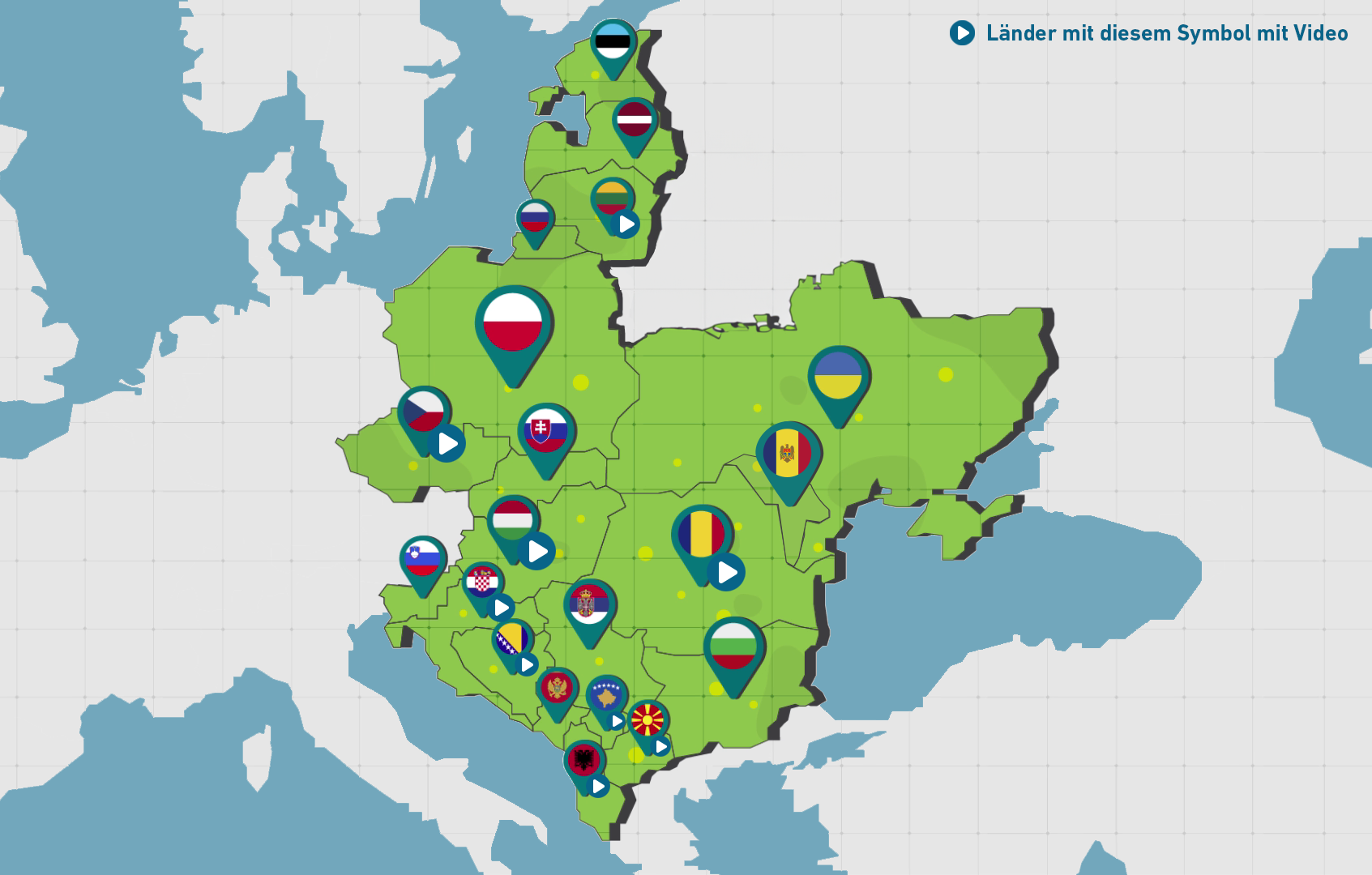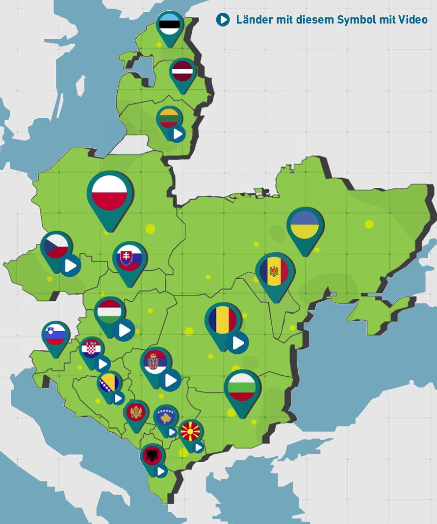 Entsprechend dem Ziel, junge Menschen im Umwelt- und Naturschutzbereich weiterzubilden, unterstützt die DBU Wissenschaftlerinnen und Wissenschaftler, die sich mit innovativen Lösungen für eine nachhaltige Gesellschaft einsetzen. Die folgende Karte zeigt die Vielfalt und das Engagement unserer aktiven und ehemaligen Geförderten. Klicke auf das jeweilige Partnerland und schaue dir die Videos mit Erfahrungsberichten und Tipps von unseren Fellows aus unserem grenzüberschreitenden Netzwerk an: