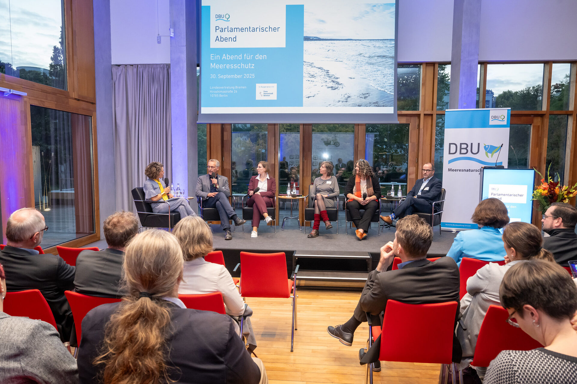 So funktioniert der StipendienschwerpunktWie der Konflikt zwischen dem Schutz von Nord- und Ostsee und der Nutzung dieses sensiblen Lebensraums gelöst werden kann, stand im Mittelpunkt des Parlamentarischen Abends am 30.09.2025 in Berlin, zu dem die DBU gemeinsam mit der Freien Hansestadt Bremen eingeladen hatte. Die Diskussion zeigte, dass es bereits erste Projekte gibt, die Hoffnung machen, zugleich aber viele offene Fragen bestehen, die evidenzbasierte Entscheidungen erfordern. Deutlich wurde auch: Nur im Zusammenspiel von Politik, Wirtschaft, Wissenschaft und Zivilgesellschaft lässt sich eine tragfähige Balance zwischen Klima- und Meeresnaturschutz erreichen.