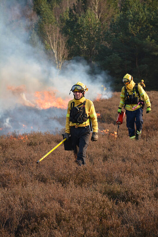 Kontrolliertes Heidebrennen von mit Menschen mit Zündmittel und Löschrucksäcken in Feuerwehruniform.