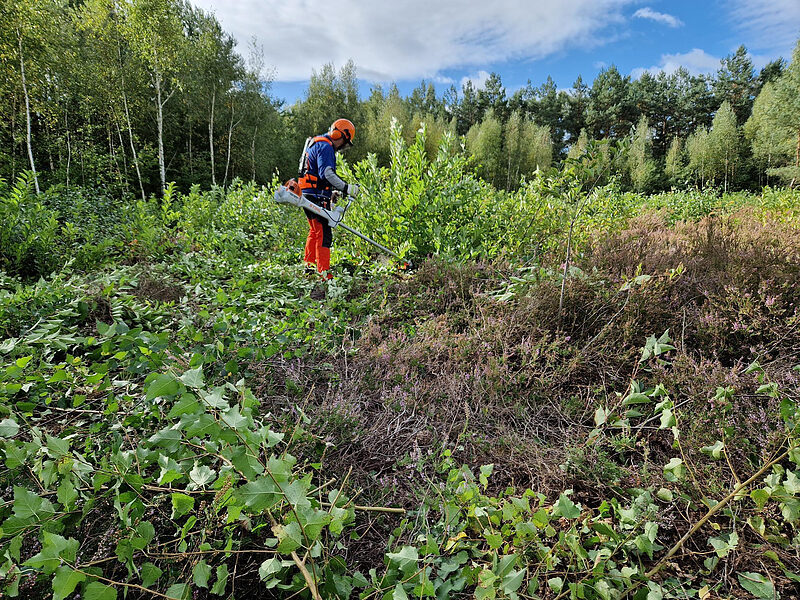 Mensch mit Freischneider auf der Heidefläche auf der DBU-Naturerbefläche Authausener Wald
