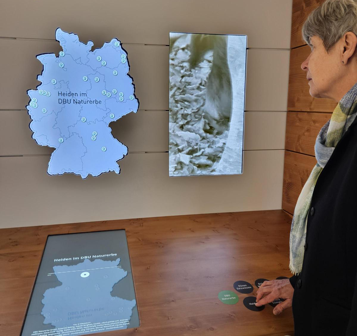 Besuchende starten ihre Entdeckungsreise durchs DBU Naturerbe per Knopfdruck am Pult des neuen Ausstellungsmoduls: Von Lebensraum zu Lebensraum. Von Vergangenheit zur Zukunft. Beispielsweise werden an der Station „Lebenswert“ Naturparadiese lebendig. „Wälder, Heiden, Gewässer, Magerrasen und Grünland, Moore und Sümpfe, Salzwiesen und Dünen – in sechs Filmtrailern stellen wir die Lebensräume auf unseren Flächen vor und geben einen Überblick unserer Flächenkulisse“, erläutert Kathrin Wiener, Projektverantwortliche im DBU Naturerbe. Auf der Rückseite informiert eine große Schautafel über die Strategien und zentralen Aufgaben. Wie auf einem Wimmelbild lassen sich mit jedem Blick neue Besonderheiten, Tiere oder Pflanzen entdecken. „Wir freuen uns sehr über das Naturerbe-Exponat als neue Attraktion des Portals. Die gesamte Dauerausstellung wird überarbeitet und in diesem Jahr erneuert“, sagt Ingrid Küsgens vom Wahner Heide Portal Burg Wissem. Die Ausstellung kann während der allgemeinen Öffnungszeiten kostenlos besichtigt werden.