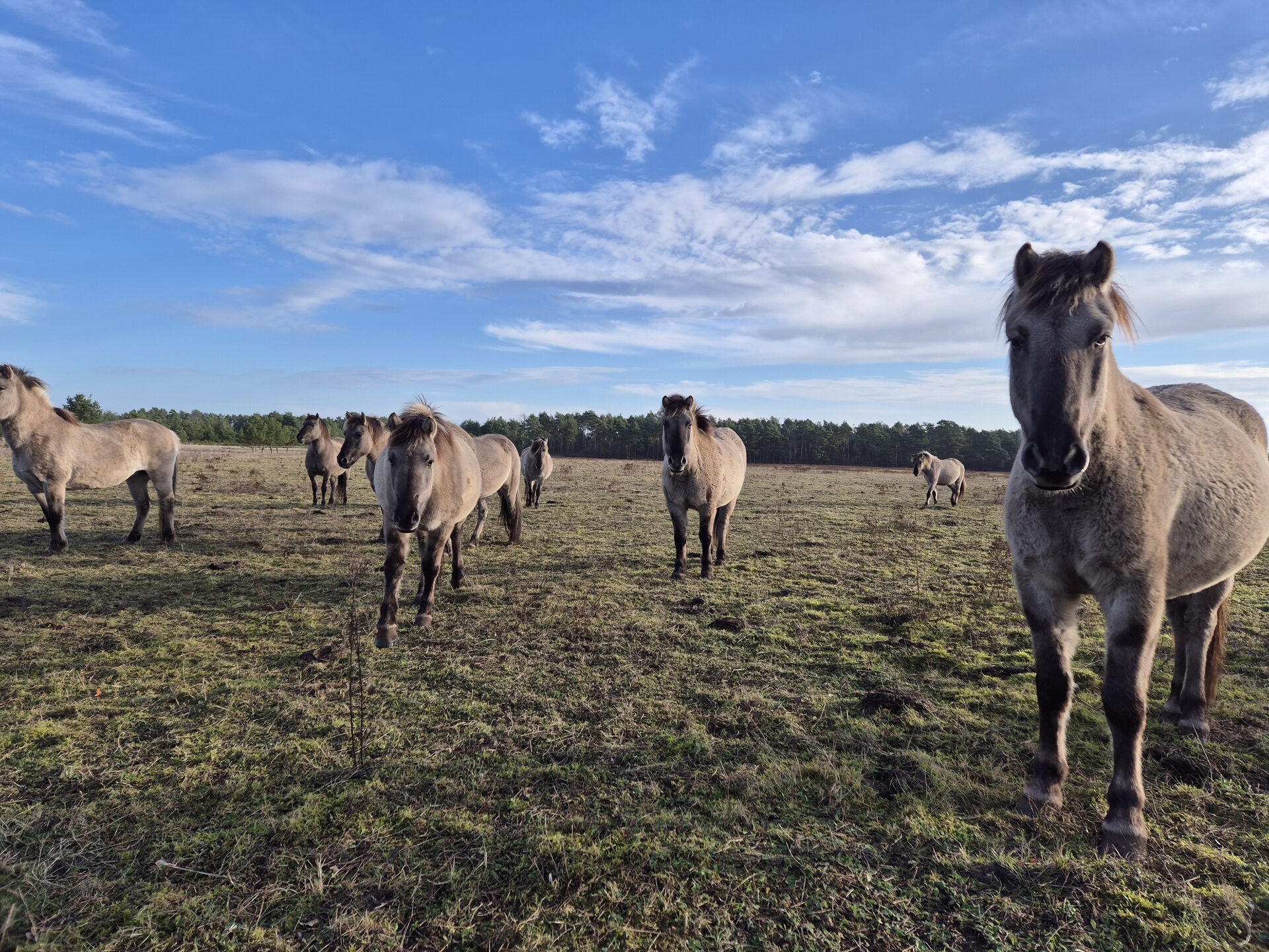 Zusammen mit Konik-Pferden (Bild) verhindern die Schottischen Hochlandrinder das Aufwachsen von Kiefern und anderen Bäumen im DBU Naturerbe. Hufescharren und Bodenwälzen der Pferde schaffen immer wieder offene Sandstellen – zum Nutzen von Silbergras und Blauflügeliger Sandschrecke.