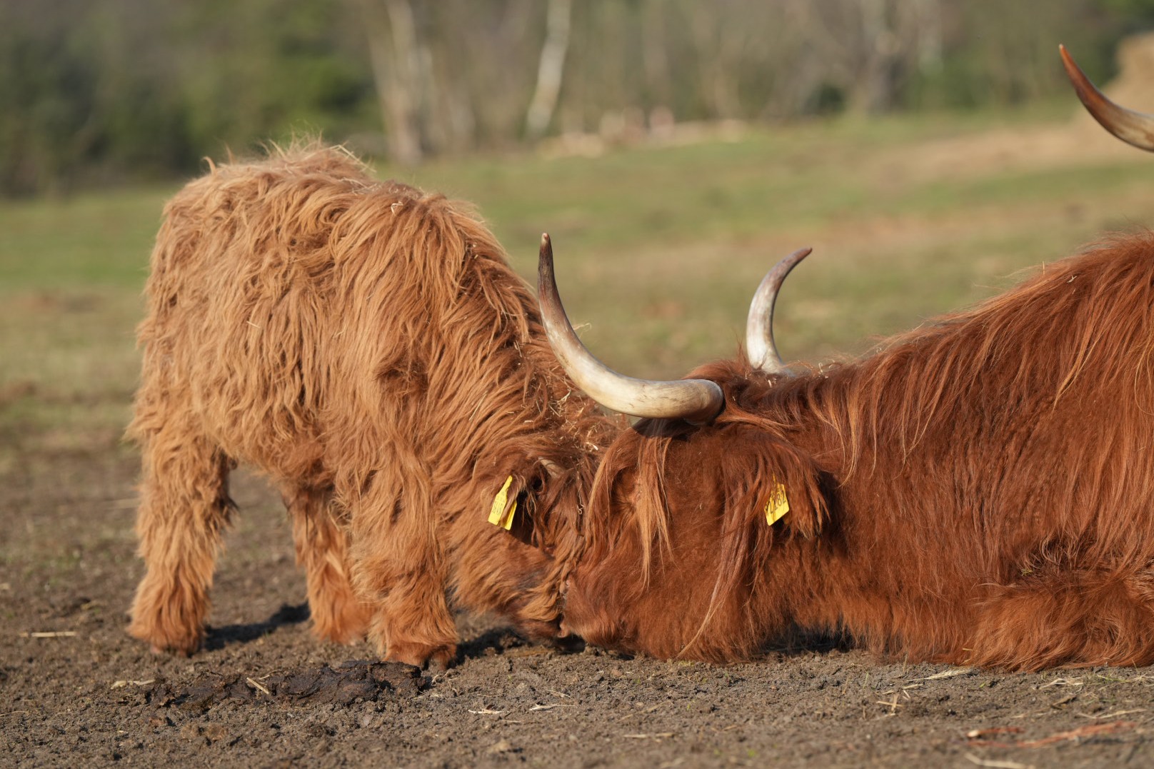 Schottische Hochlandrinder und Konikpferde stellen sich auf Frühling ein