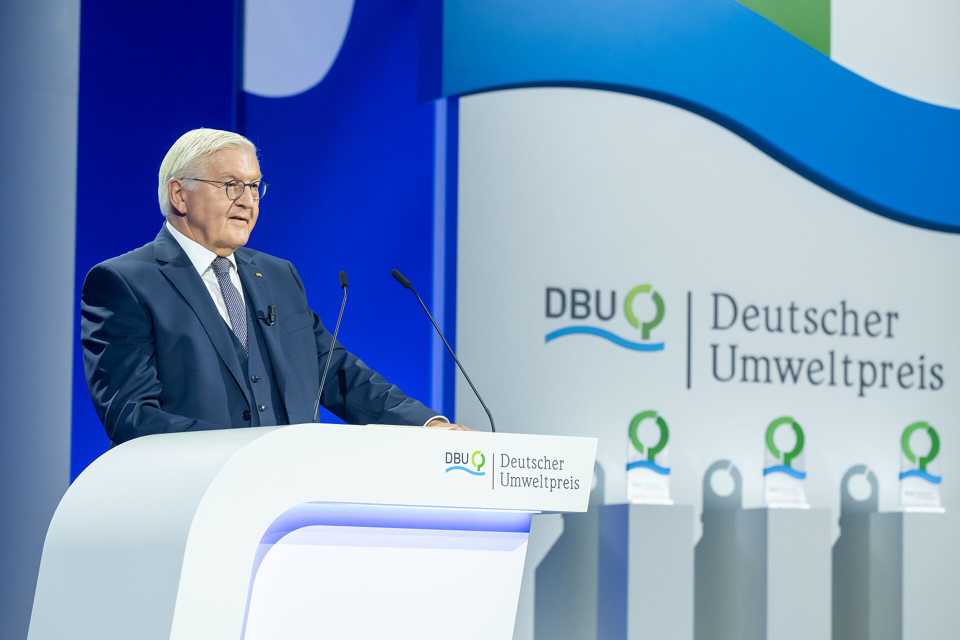 Steinmeier ist zum neunten Mal in Folge beim Festakt dabei. Ganz bewusst habe er als Bundespräsident „bisher keine Verleihung des Deutschen Umweltpreises ausgelassen“. Das sei inzwischen „wie ein Besuch bei der Familie“. Jedes Jahr aufs Neue staune er darüber, „was für wegweisende, begeisternde Menschen sich für den Umweltschutz einsetzen“. Sie alle leisteten „mit ihren tollen Ideen ihren ganz besonderen, unersetzlichen Beitrag zur großen gemeinsamen Sache“. Der „Pioniergeist, die spürbare Neugier und die Unerschrockenheit, auch immer wieder Neues zu wagen“, beeindrucke ihn besonders beim Deutschen Umweltpreis, so Steinmeier. „Ihr seid wunderbar“, sagte der Bundespräsident.