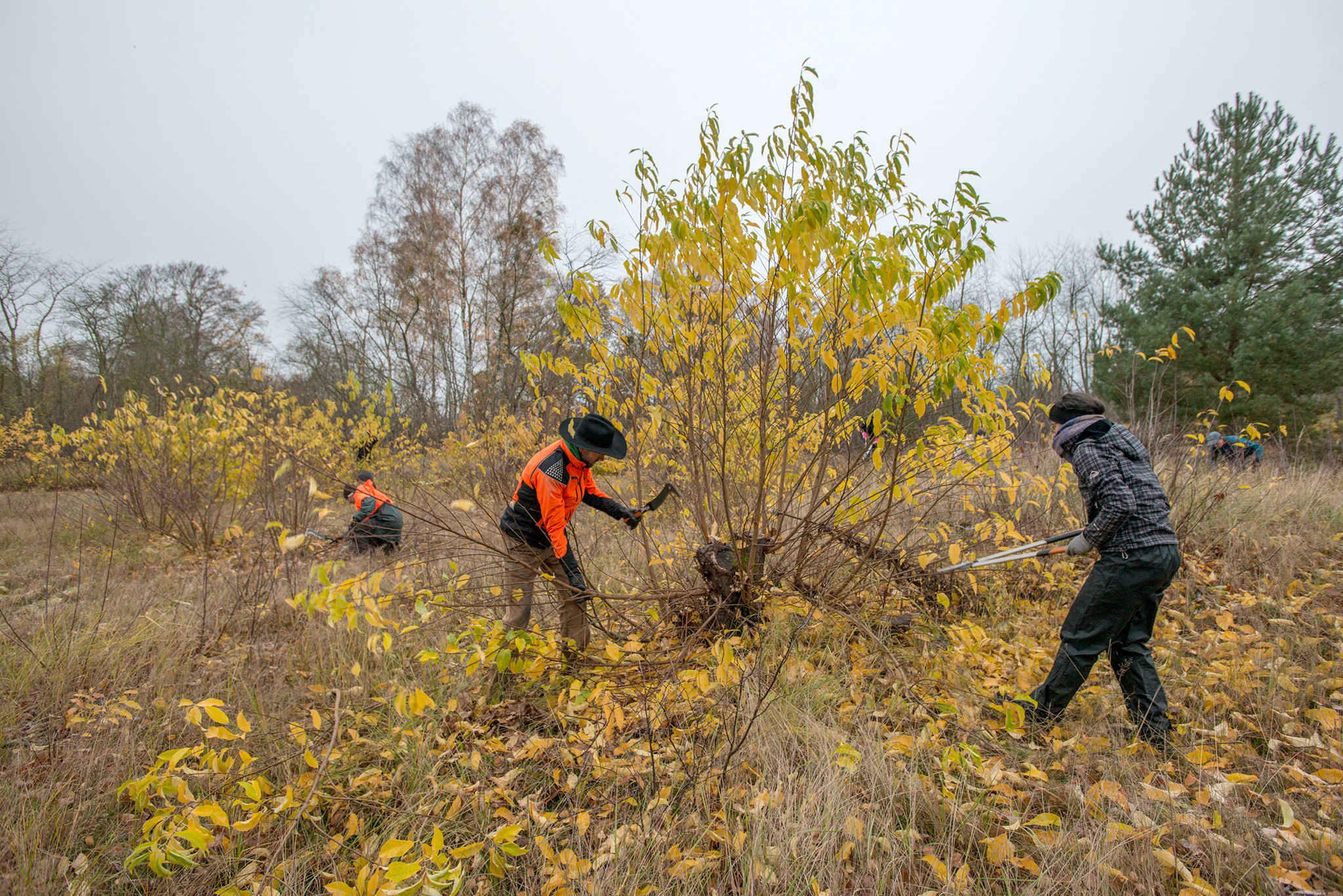 Freiwillige schneiden auf der DBU-Naturerbefläche Ueckermünder Heide Gehölzaufwuchs mit Pflanzenschere zurück.