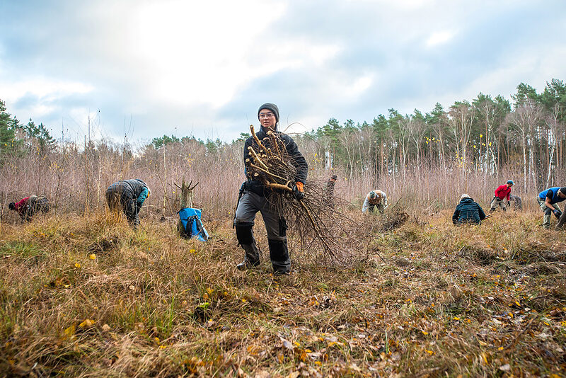 Freiwillige schneiden Gehölzaufwuchs auf der DBU-Naturerbefläche Ueckermünder Heide zurück und eine Freiwillige trägt das Geäst aus der Fläche.