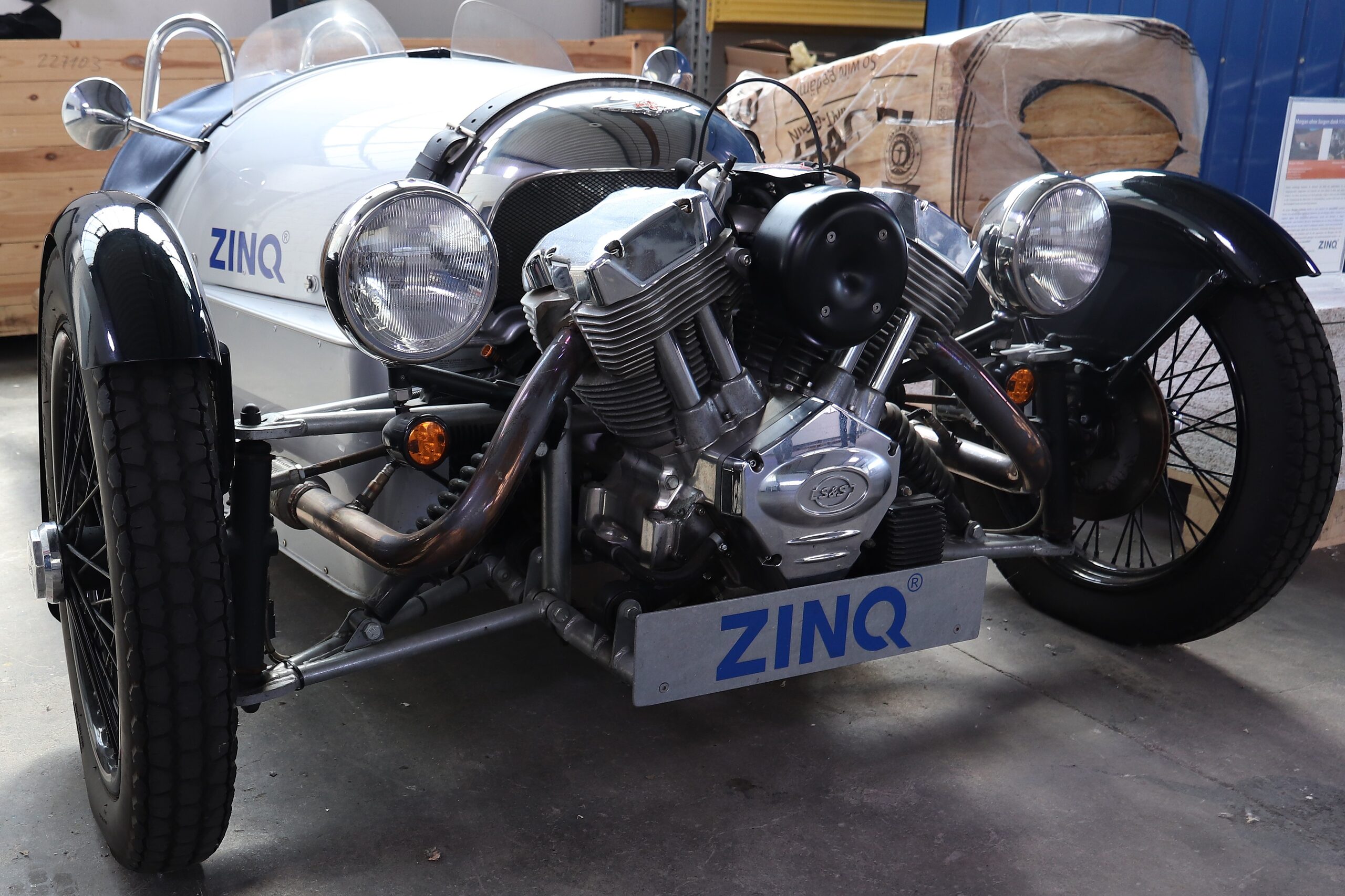 Ein Morgan-3-Wheeler. Der dreirädrige Roadster der Morgan Motor Company aus Holz, Aluminium und Stahl ist im Stahlverzinkungsbetrieb ZINQ am Standort Hagen mikroverzinkt worden, mit einer Deckschicht dünner als ein Haar. Das ZINQ-Geschäftsführungsduo Lars Baumgürtel und Dr.-Ing. Birgitt Bendiek erhalten 2025 den Deutschen Umweltpreis der DBU Beschreibung