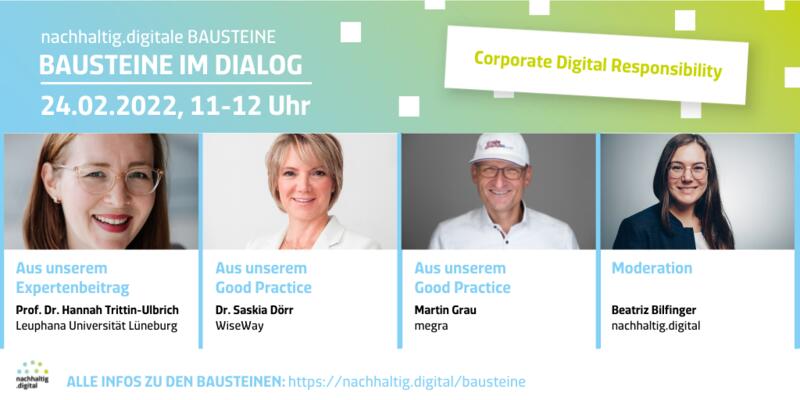 Die Reihe „Bausteine im Dialog" der Kompetenzplattform nachhaltig.digital wird auch 2022 fortgesetzt. Im ersten „Baustein" am 24. Februar 2022 von 11:00 bis 12:00 Uhr geht es um die Fragen: Was ist Corporate Digital Responsibility? Wie funktioniert CDR für Unternehmen?