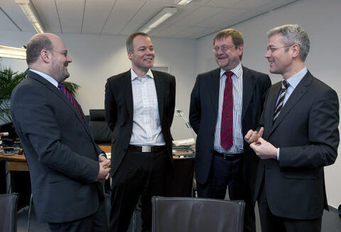 Bundesumweltminister Dr. Norbert Röttgen (rechts) hat Ende Januar drei neue Mitglieder in das Kuratorium der Deutschen Bundesstiftung Umwelt (DBU) berufen. Neu sind der Staatssekretär im Bundesumweltministerium, Jürgen Becker (2. v. r.), der Parlamentarische Staatssekretär beim Bundesminister der Finanzen, Steffen Kampeter (links), sowie Bundestagsabgeordneter Matthias Miersch (2. v. l.), Mitglied im Umweltausschuss. Ersetzt werden die ehemaligen Kuratoren Matthias Machnig, derzeit Wirtschaftsminister in Thüringen, Werner Gatzer, Staatssekretär im Bundesfinanzministerium, sowie die ehemalige Bundestagsabgeordnete Petra Bierwirth. Röttgen dankte den ausgeschiedenen Kuratoren für ihre Arbeit.