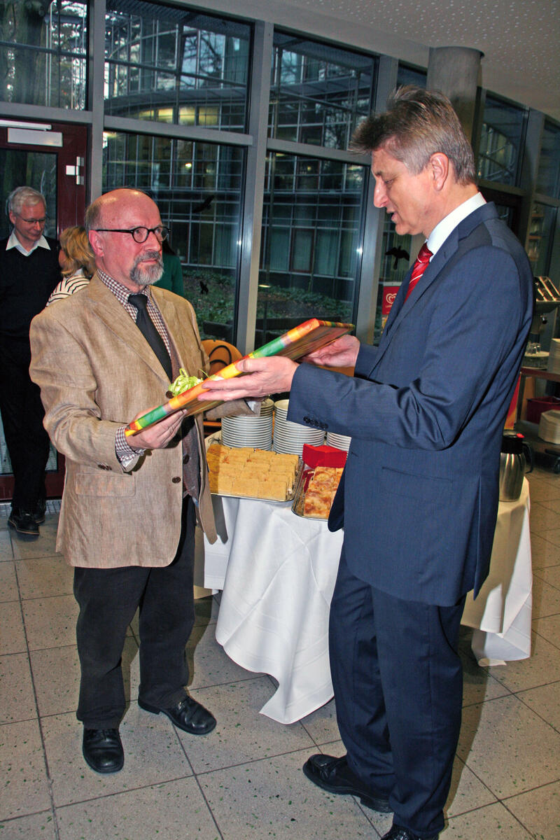 Wilhelm Kulke (links) wurde Ende Januar nach 17-jähriger Tätigkeit für die DBU von Generalsekretär Dr.-Ing. E. h. Fritz Brickwedde (rechts) in den Ruhestand verabschiedet. Kulke war über die Jahre in verschiedenen Funktionen für die DBU tätig: als Sonderbeauftragter für die Neuen Länder, als ITUT-Projektleiter und -Geschäftsführer sowie als Sonderbeauftragter für Ost-Europa und zuletzt als Senior-Expert. Brickwedde dankte dem scheidenden Mitarbeiter für seinen Beitrag zur Fördertätigkeit der DBU in den mittel- und osteuropäischen Staaten und hob in diesem Zusammenhang die rege Reisetätigkeit Kulkes hervor. Dieser habe in seiner aktiven DBU-Zeit die Distanz Erde-Mond mehr als zweimal zurückgelegt.