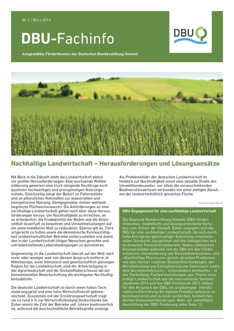 Diese und andere Fragen standen im vergangenen Jahr im Fokus des DBU-Fachforums »Konturen einer nachhaltigen Landwirtschaft«. Im Nachgang ist nun ein zwölfseitiges DBU-Fachinfo mit dem Titel »Nachhaltige Landwirtschaft – Herausforderungen und Lösungsansätze« erschienen. Neben den oben genannten Schwerpunkten werden auch die Themen Phosphatrecycling und Pflanzenschutz aufgegriffen und Ansätze zur Nachhaltigkeitsbewertung landwirtschaftlicher Betriebe vorgestellt.