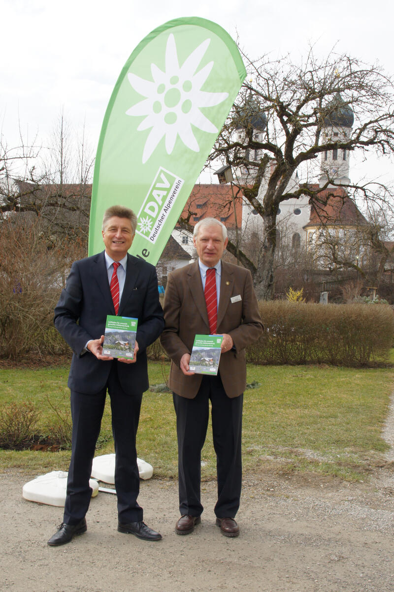 Der »Leitfaden für Umweltgerechte Hüttentechnik« fasst die Ergebnisse einer DBU-geförderten Evaluierung der Ver- und Entsorgungssysteme von 100 Gebirgshütten im Alpenbogen zusammen. Der Vizepräsident des Deutschen Alpenvereins (DAV), Ludwig Wucherpfennig (rechts), und DBU-Generalsekretär Dr. Fritz Brickwedde präsentierten die soeben erschienene »Gebrauchsanweisung« für alle Fragen der Energieversorgung und der Entsorgung auf dem 11. Internationalen Hüttenfachseminar im Zentrum für Umwelt und Kultur des Klosters Benediktbeuern.