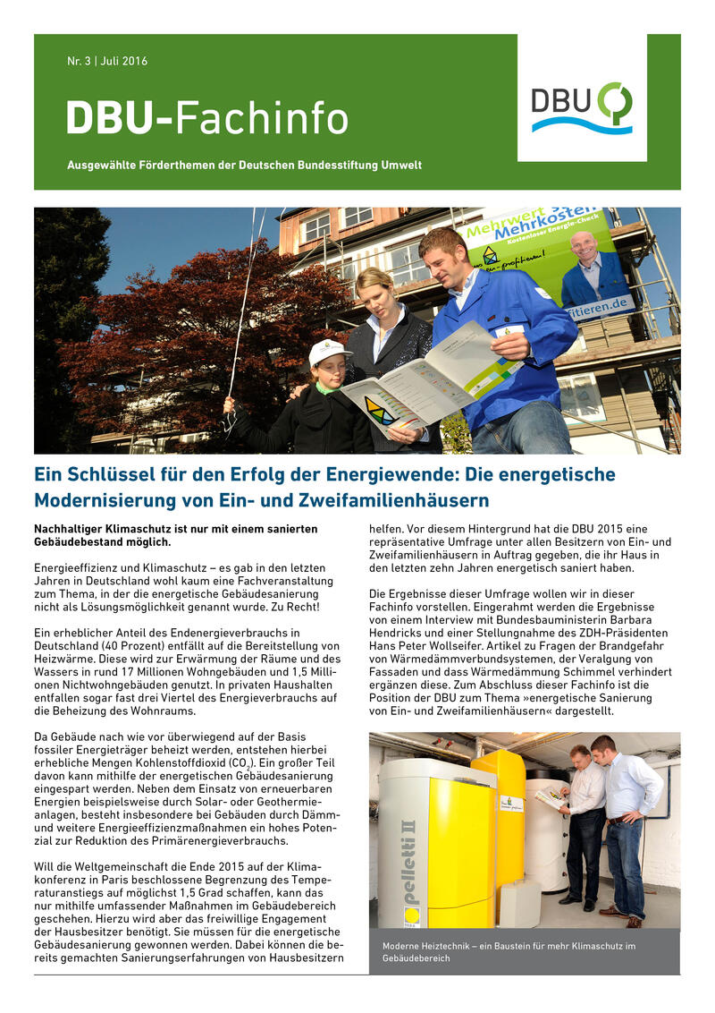 Im Interview äußert sich auch Bundesumwelt- und -bauministerin Dr. Barbara Hendricks zum Thema. Um die im Pariser Klimaschutzabkommen vereinbarten Ziele zu erreichen, ist es notwendig, den Gebäudebestand in Deutschland bis 2050 klimaneutral zu stellen. Ein großer Teil der Treibhausgasemissionen stammt aus Ein- und Zweifamilienhäusern. Nach Auffassung der DBU sollten daher Hauser so saniert werden, dass ein möglichst umfassender Beitrag zum Klimaschutz geleistet wird. Ratsam sei, für jedes zu sanierende Haus ein umfassendes und individuell abgestimmtes Konzept für den Umbau zu erstellen.